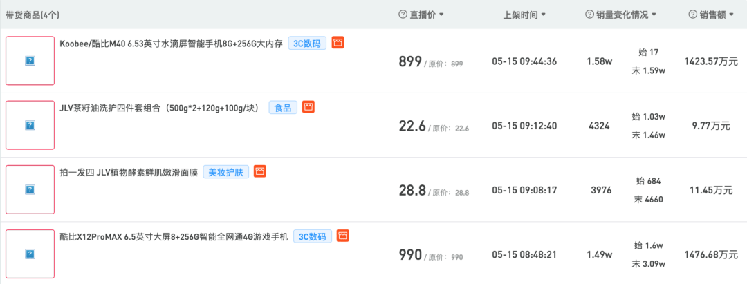 开菠萝财经根据新快数据统计,“驴嫂平荣”直播间在4月25日-5月24日期间30天的29场直播中,售卖了7个品牌的21款机型,涉及到的品牌除了朵唯,还有索爱、酷比、天语、糖果、守护宝等,单机售价在769元到1499元不等,累计销量近45万台,月销售额接近4.5亿元。