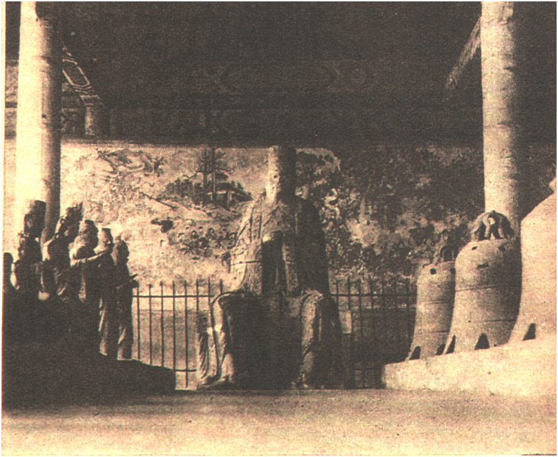 从收集到的早期老照片来看,清末的天贶殿基本保存完好,为规模宏大的高规格的宫殿式建筑,外观上看,它采用重檐庑殿顶,上悬匾额“峻极殿”,门窗为典型的官式做法(见图1、2)。从殿内部来看,内檐为典型的清式旋子彩绘做法,壁画保存基本完好(见图3),侍从塑像高大精美(见图4)。