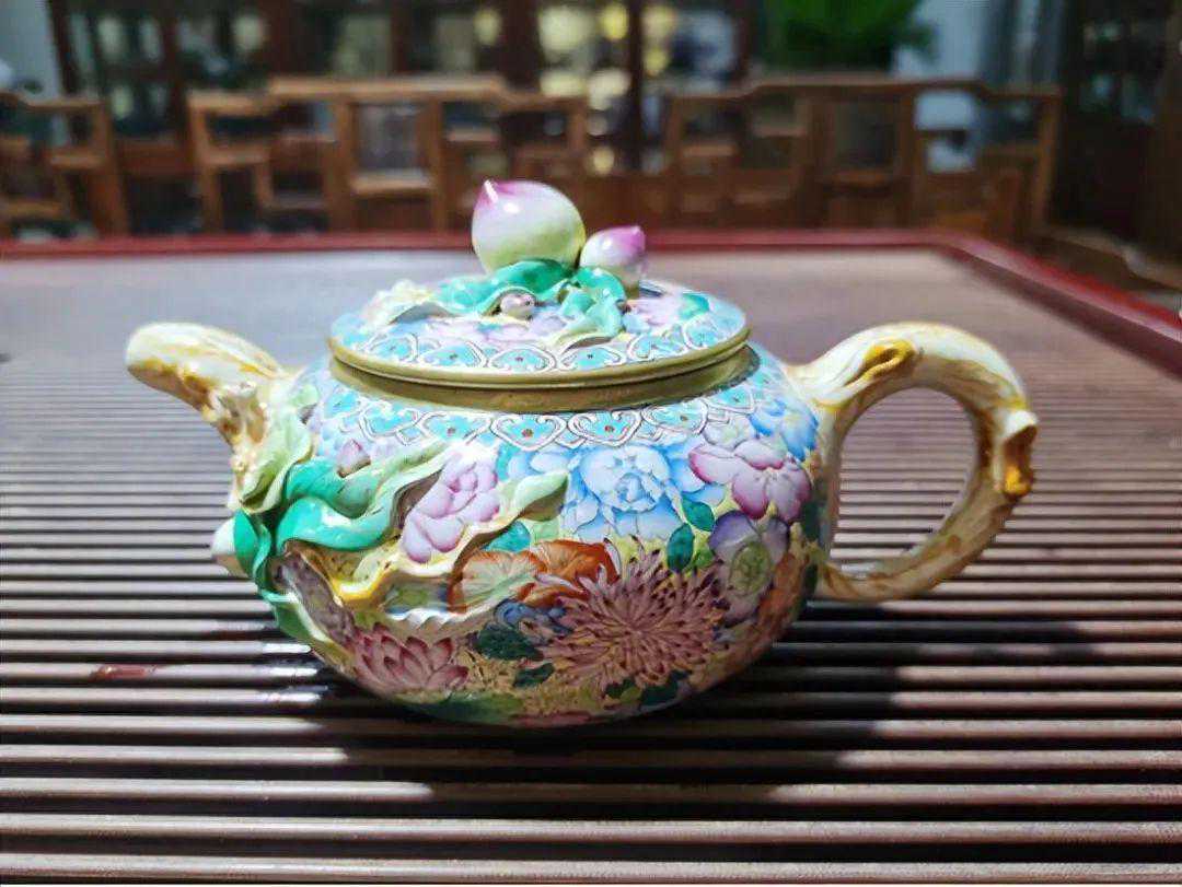 简介:桃,鲜果也。民间素有福寿绵绵,长命百岁之说。作者把寿桃的美艳动人和绵绵寓意融入紫砂艺术之中。整器以寿桃为主体,壶身成抛物线状,线条自然美观,一气呵成。壶盖与壶口贴合紧密,盖沿平整光滑。壶嘴、壶把作桃枝状。壶身贴叶柔美可人,神韵翩然。壶纽作两颗硕大的寿桃为画龙点睛之笔,将全壶提携神韵,并以珐琅彩工艺装饰,予人盈盈丰硕的美感与喜悦。