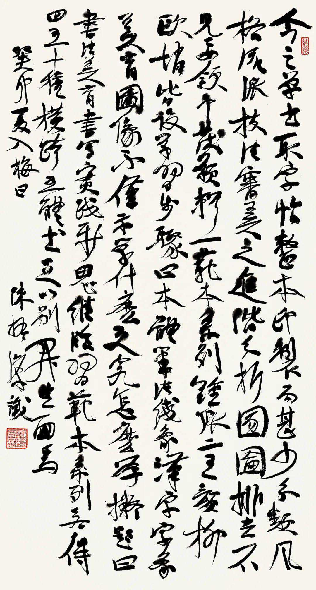 澎湃新闻在现场看到,展览呈现出多元面貌与风格。以人物画家而言,他们中有将传统线描技法与写实造型结合在一起者;也有提炼文人画的笔墨、意趣与精神,将当代多元的表现主义手法融入传统之中者;山水画家注重面向传统,有的追溯宋元,有的取法明清,有的立足当下观念关照或审美感受;花鸟画家有深得古意的大写意画风,有融汇宋人工笔和文人意趣者;书法篆刻方面汇聚了多位当代具有重要影响力的名家,或以巨幅大草见展,或以手卷小行书示人,均传递出浓浓的书卷气息。
