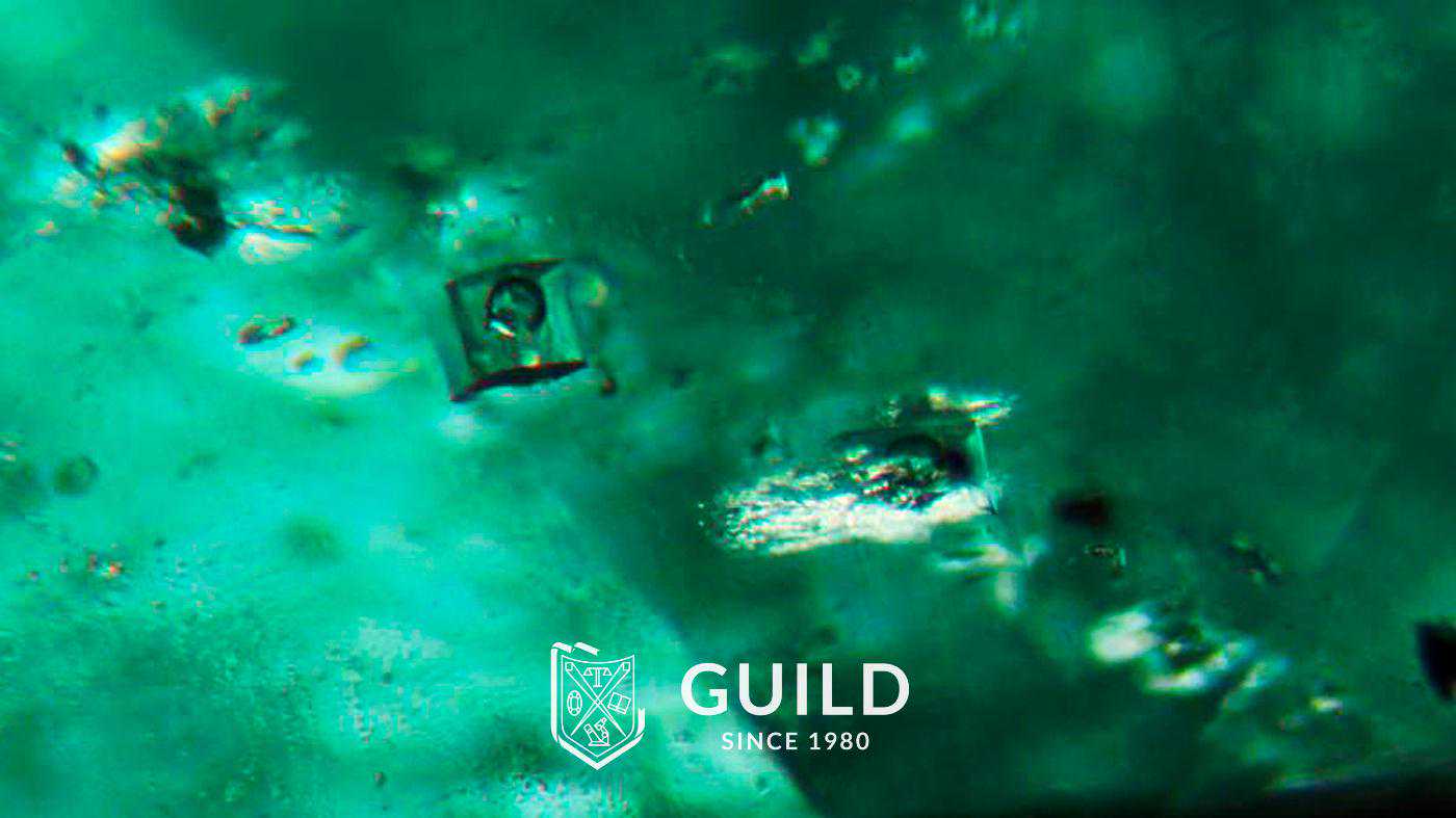 哥伦比亚祖母绿具有特征的气、液、固三相包裹体,三相边缘多呈锯齿状或不规则形状。固态包裹体多为方解石、黄铁矿、白云母、石英、氟碳钙铈矿等,铁质氧化物颗粒小时为小黑点。​此外,可见不规则的锯齿状生长纹、平直色带等生长特征。