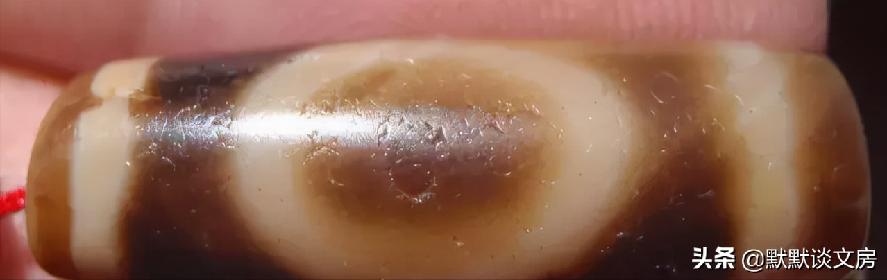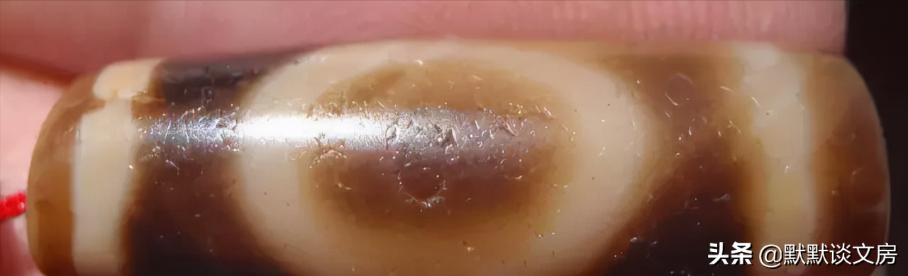 4.朱砂,借助放大镜观察,能看到天珠内非常细小漂亮的红点。一般人更喜欢朱砂满满的天珠,认为是福报满满。朱砂应该是玛瑙内铁元素表现出来的红色斑点,大约80~90%的至纯天珠或多或少有朱砂(旁系天珠基本没有朱砂)。据说原本没有朱砂的天珠佩戴后可能产生(但是不知道得戴几百年几千年才行?)。另外很多普通红玛瑙内部也有很多朱砂点,所以朱砂这一特征要综合考虑。