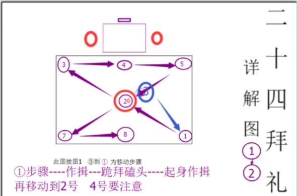 二十四拜的跪拜礼,与一跪三叩首、三跪九叩首相比,作揖和磕头的动作都一样,没有区别。二十四拜是跪八次磕二十四个头,共有八个地点要作揖磕头,每一次跪拜礼都是作揖一个、跪一次、磕头三个,基本步行图是八字形,吊唁者的具体行礼步骤和动作是:
