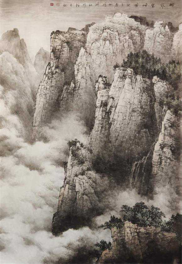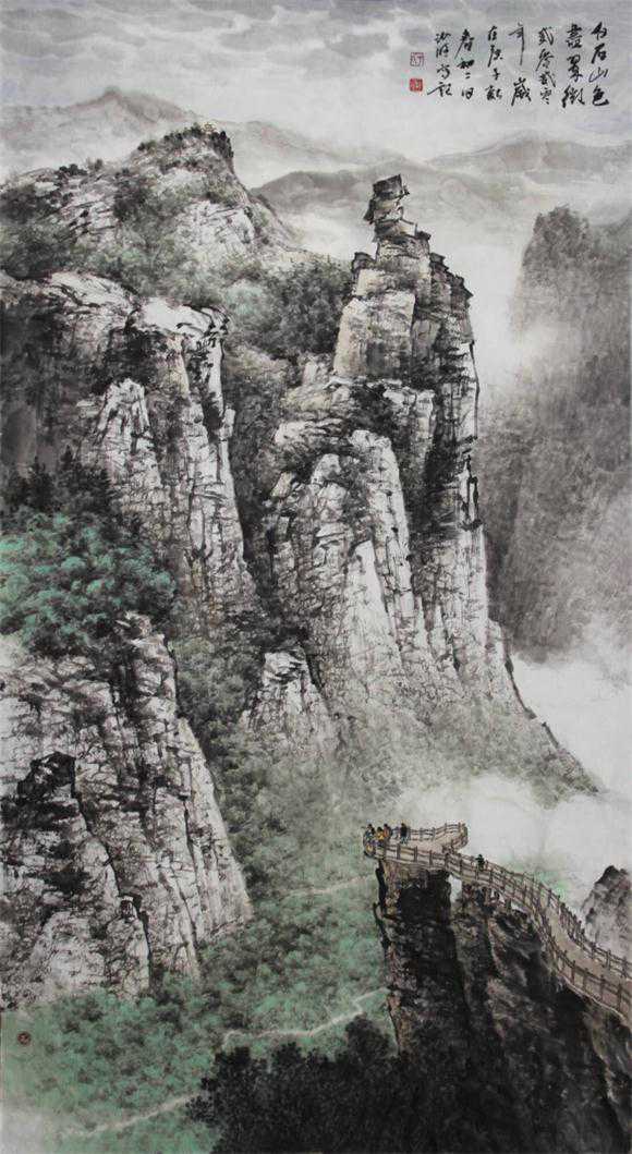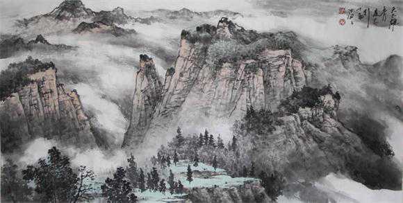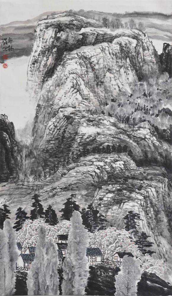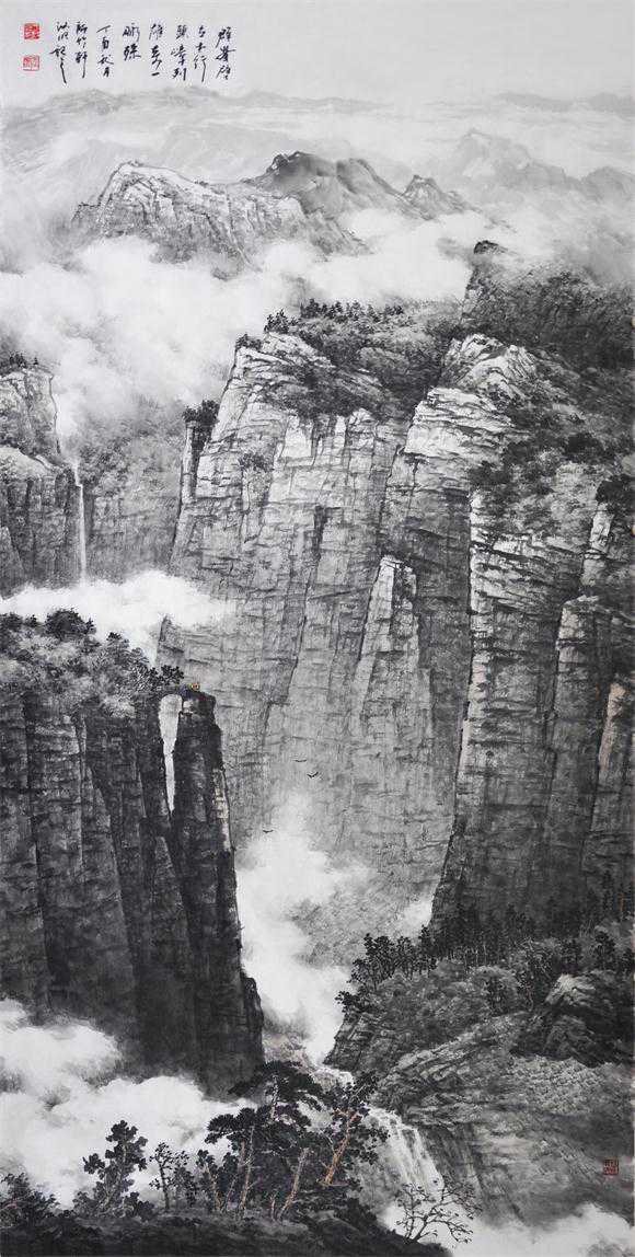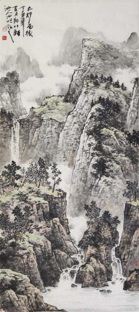 观其作品《太行浩气存千古》,画中巨峰巍然耸矗,山涧中瀑布倾泻而下,峻厚的山体岩石皴纹历历可辨,显示出一种逼人的磅礴气势;山脚下雾气迷蒙,近处大石兀立、溪水潺潺,烟岚轻动。就作品来看,下笔匀直,笔精墨润,以折带皴粗笔重墨勾勒出山岩峻峭刻削的轮廓结构,用坚劲沉雄的笔触反复作斧劈皴、刮铁皴,塑造出山岩的向背肌理和质感,以表现山形凸凹和北方山石铁打钢铸般的风骨。然后反复施以水墨渲染,使画面既浑厚又不干枯,既滋润而又沉着,很好地衬托出山势的险峻硬朗,沉着厚重。