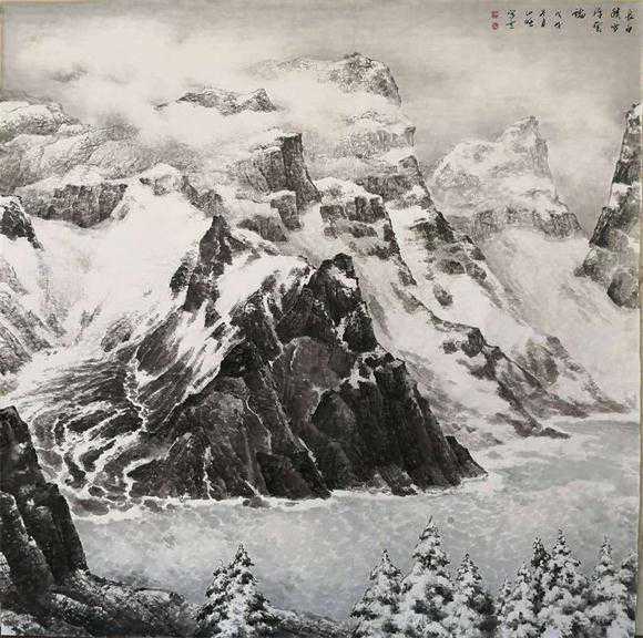 而《长白积雪浮云端》、《素裹银妆图》、《长白圣境天下奇》表现的则是大雪覆盖下的深山幽谷。皴笔不多却坚硬有力,章法严整而有变化,墨色渲染出阴霾的天空,更加衬托出雪岭高寒的气氛。以沉稳老辣的笔墨画出了雪后北方山川的奇观,山势嵯峨,岩壑幽深,峻岭起伏,错落而有气势。