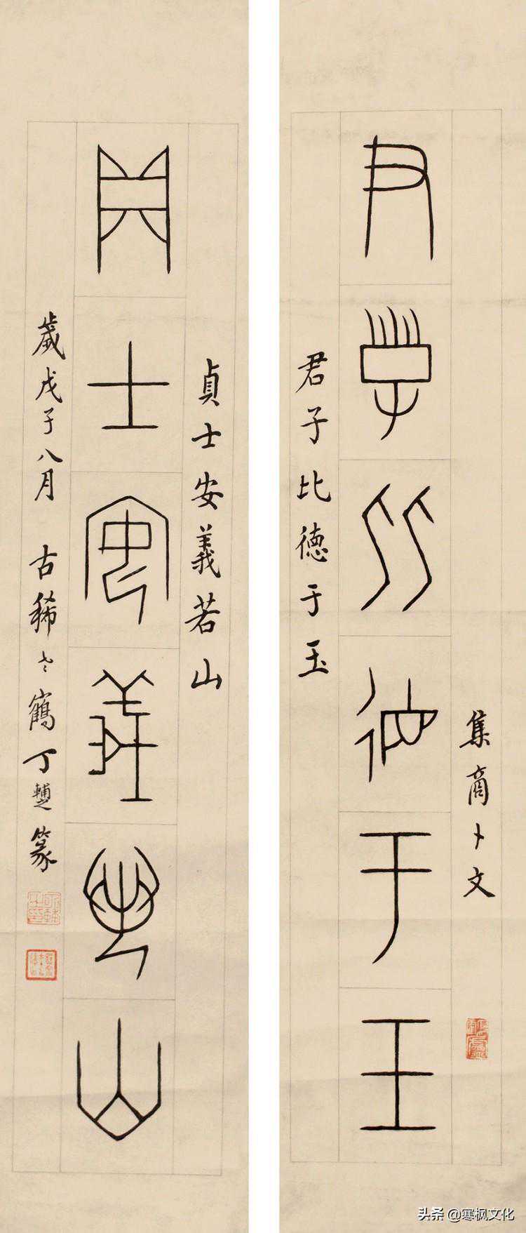 丁仁(1879-1949),原名仁友,字辅之,号鹤庐,浙江杭县人,民国时期著名篆刻家、书画家、收藏家、诗人。丁老德高望重,才华横溢,诗、书、画、印无所不涉、无所不精。其精通楷、行、篆三体,尤其擅长甲骨篆书,篆书规方矩圆,古朴工丽,笔意潇洒。
