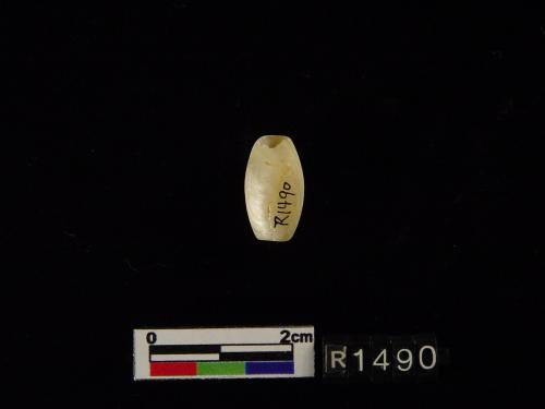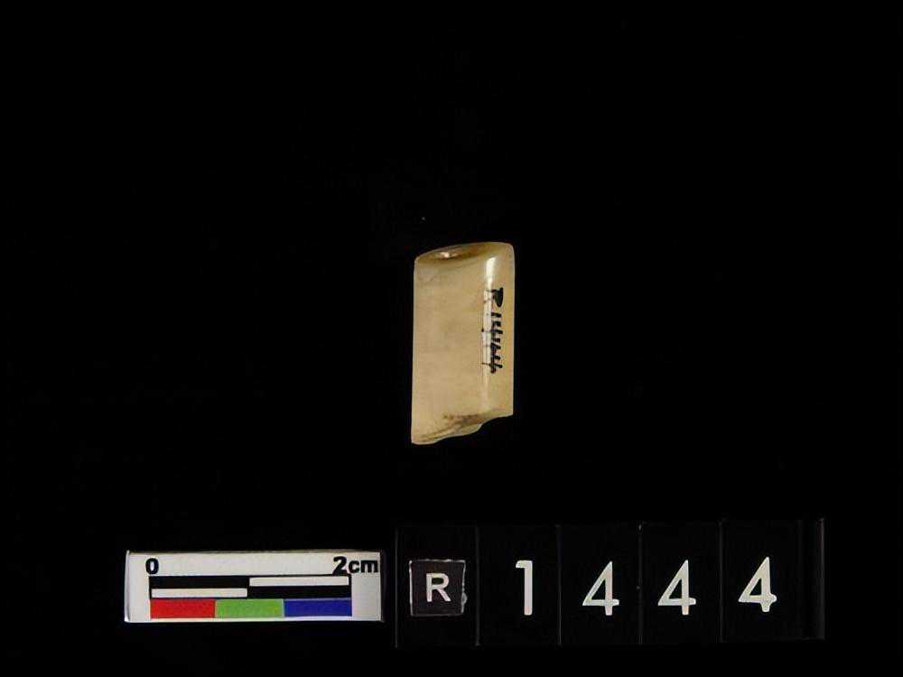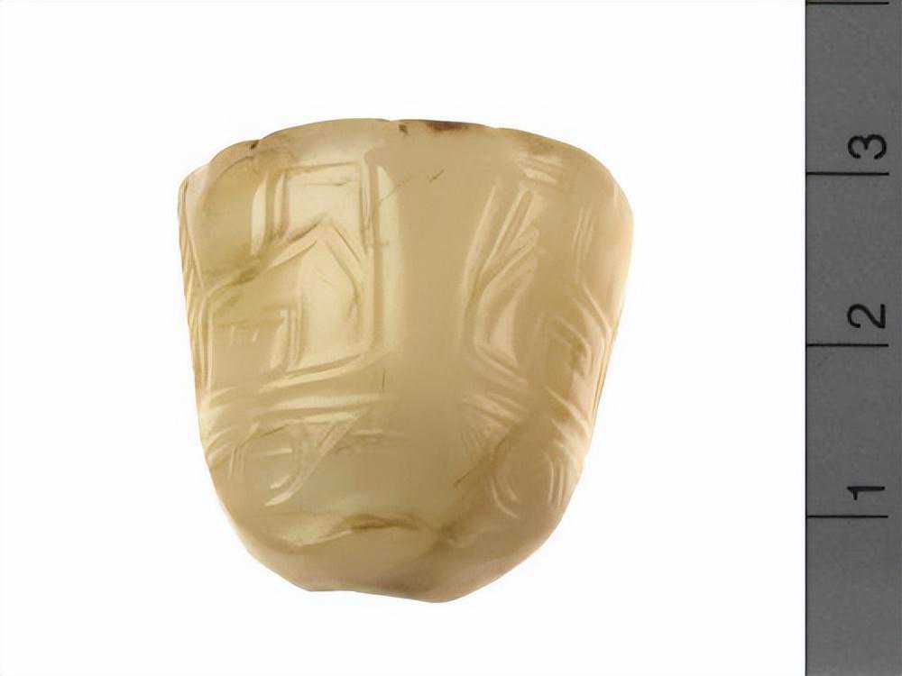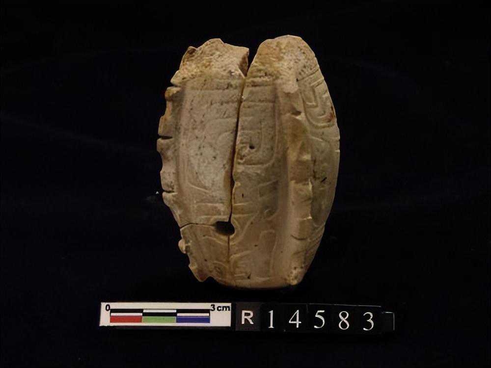 器为弧状,两端有孔,外面刻有带目文之纹饰两组,色白,微有斑。