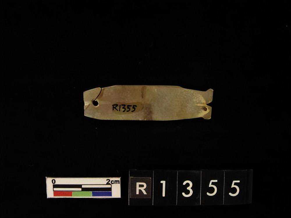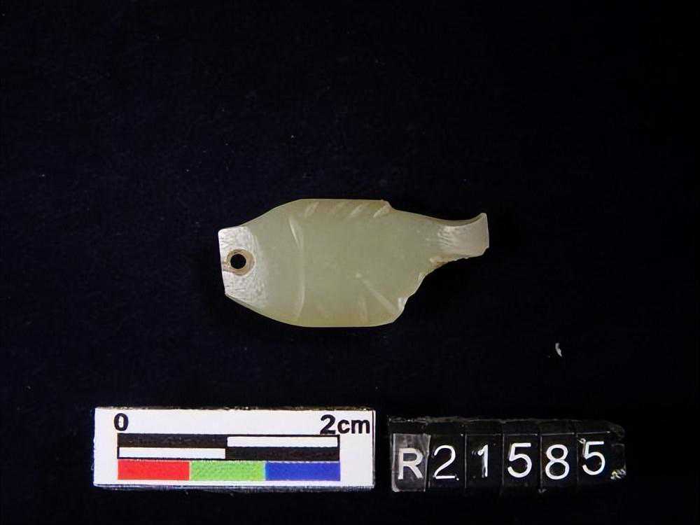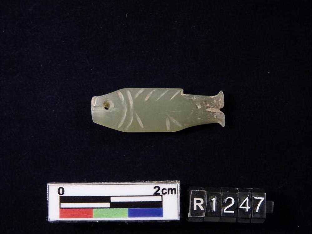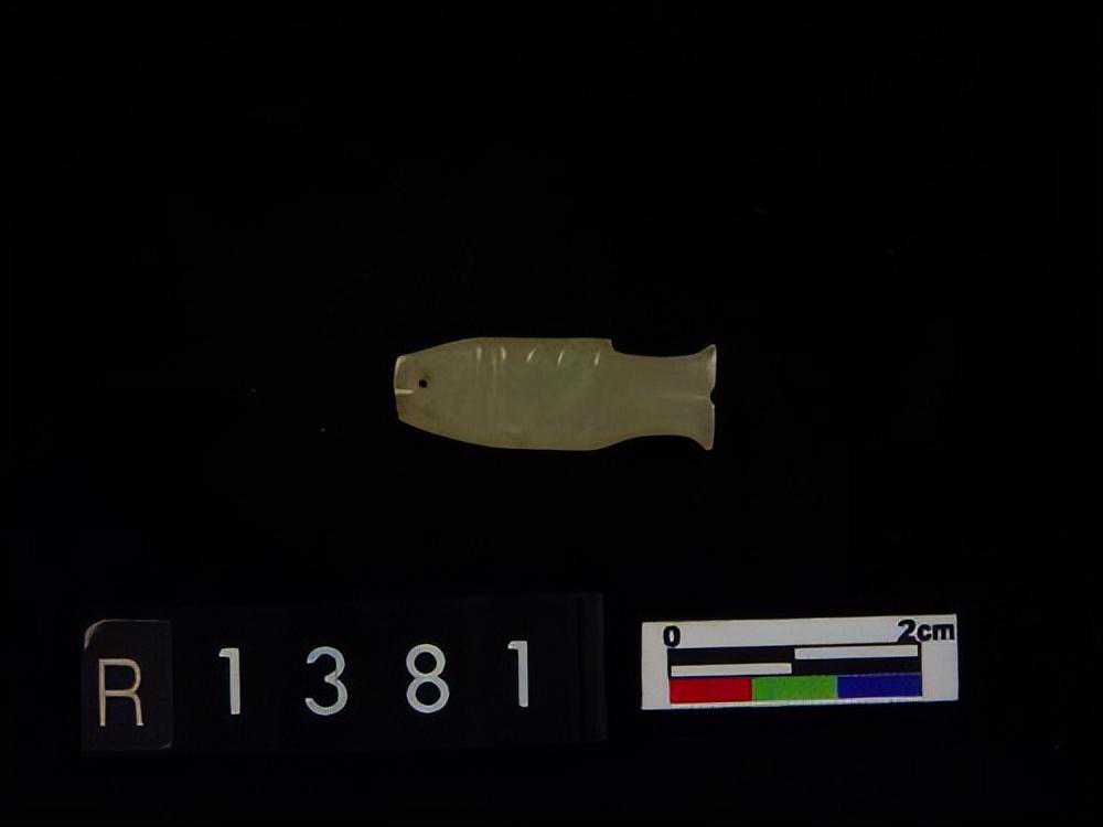 1443墓。。。玉鱼璜,目為一小孔,背腹鰭均為細小之刻文,尾薄如刀刃。。。