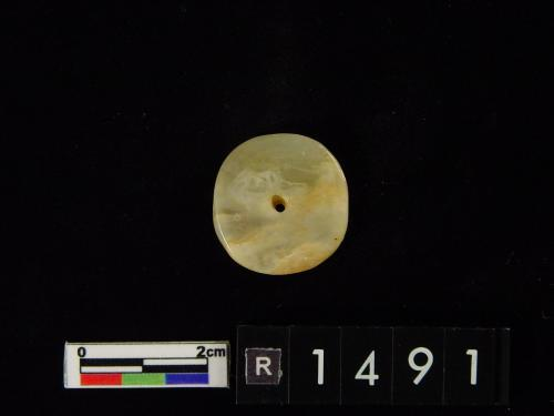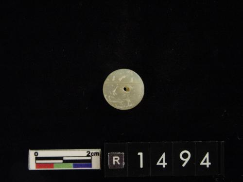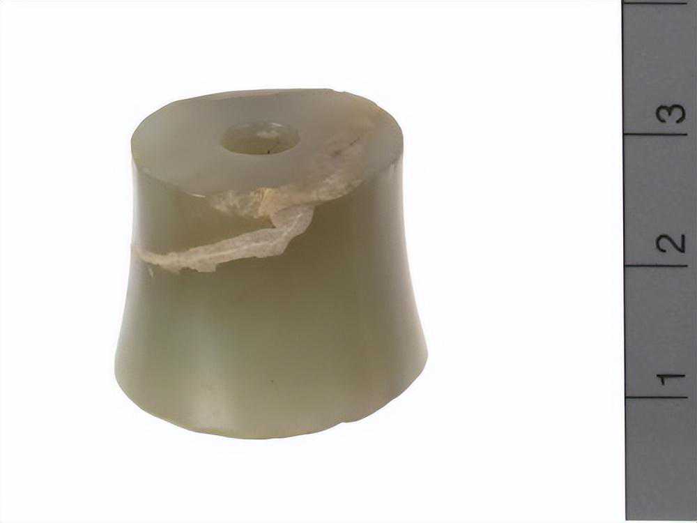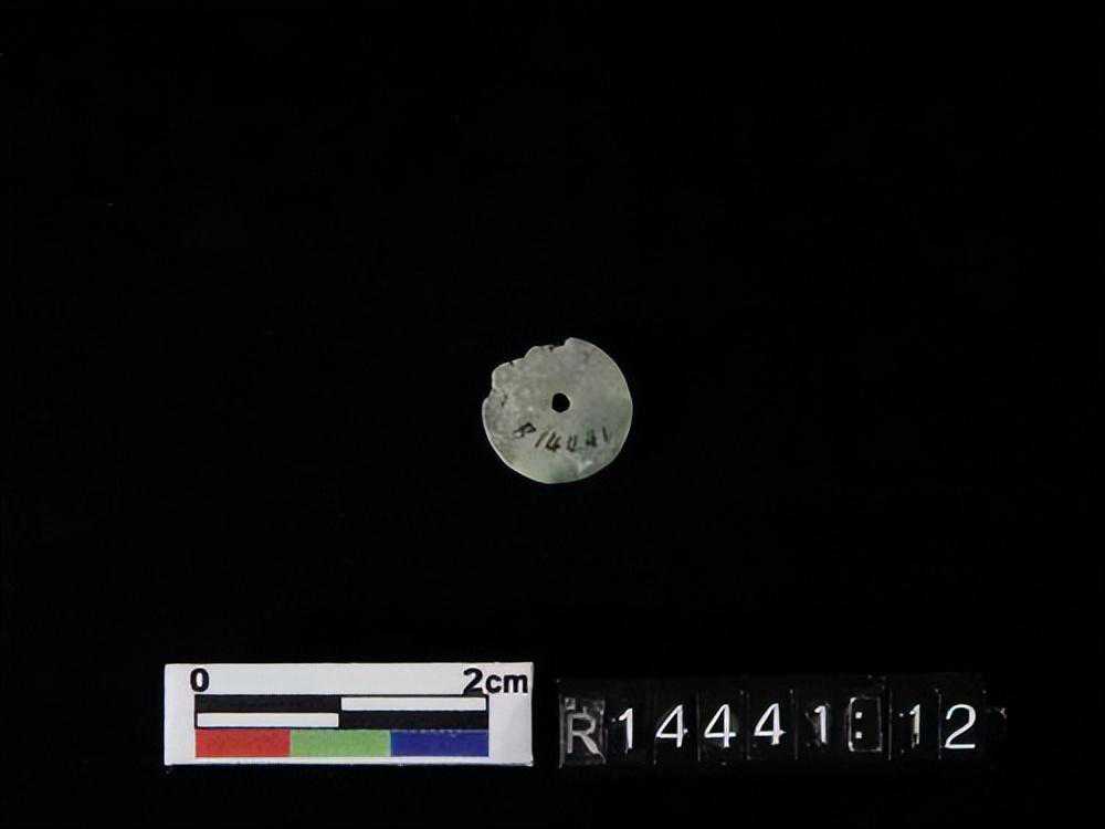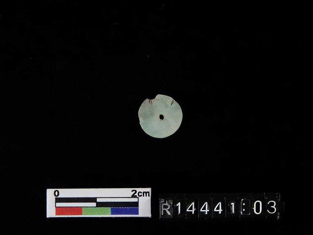 色灰白,杂绿斑,形式同1550-40墓里出的玉凸边璧(R00912)。