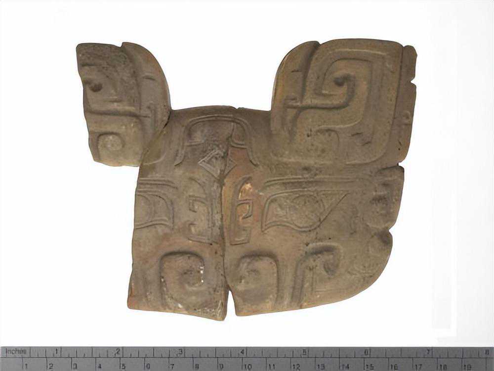 为一平面雕刻,背凹而面略凸,头上两角属曲,两旁有两小耳,双目圆睁鼻大,下为一槽,形极狞恶,色白,有涂硃痕。