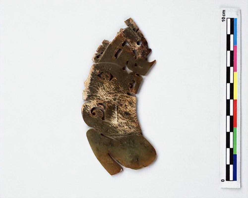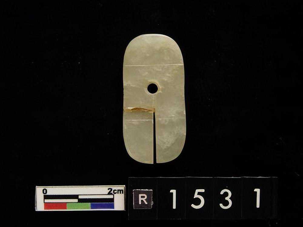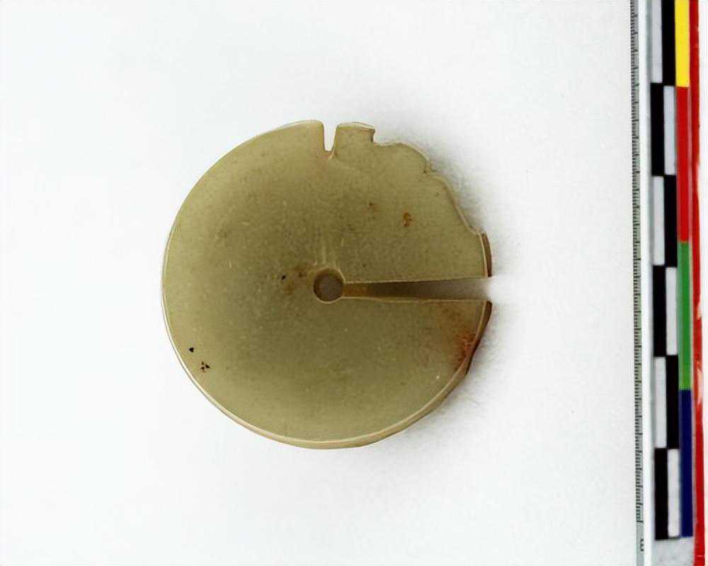 为蟠龙之侧面,口为一长槽,中为一穿,两者相连而实不连,色淡白。