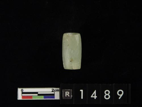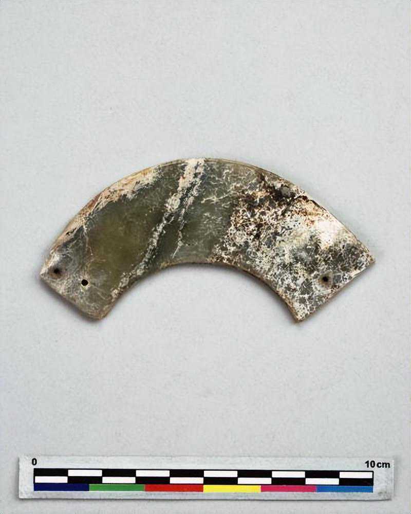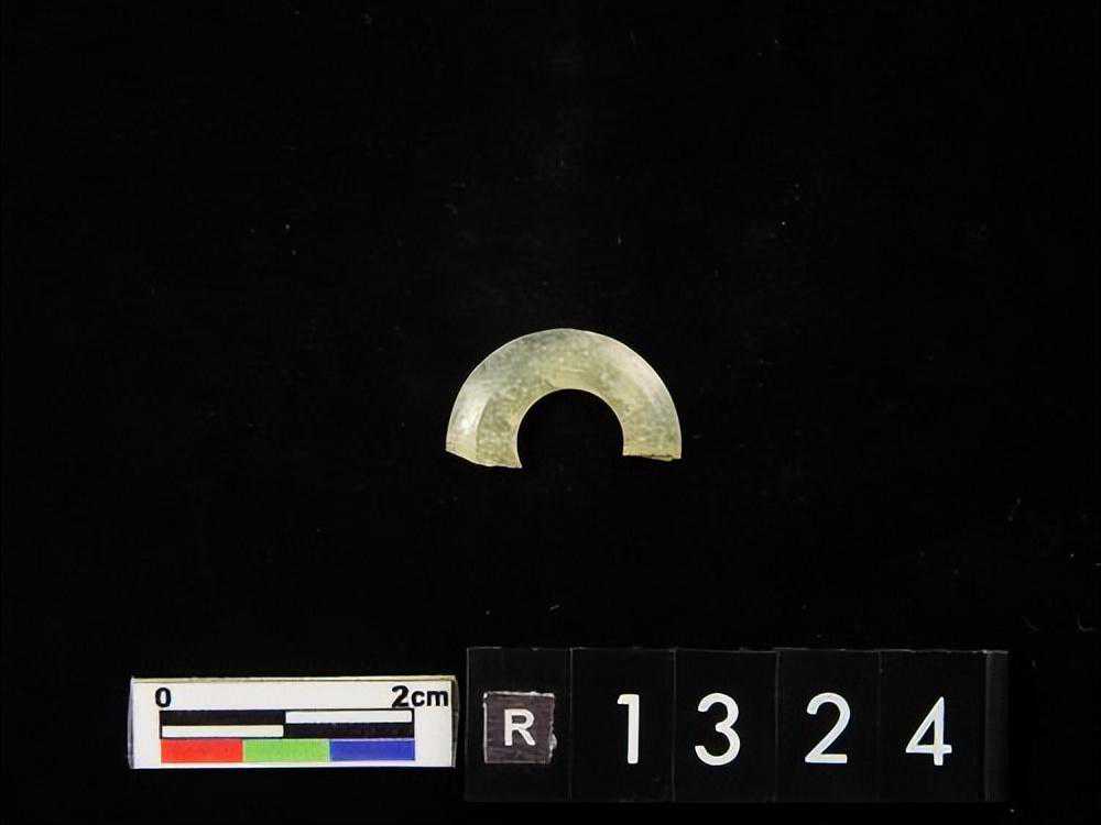半圆形,一端残缺,一端有一小缺口,质极硬,色青绿