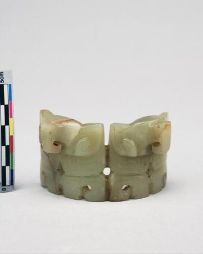 立体兽面,目、口、牙、角均刻饰极精,鼻梁及两耳做镂空之脊状,故横剖面成为三角形,上下斜坡之平面,中有一穿,背面刻饰一不全之蝉文,又似截断下来者,色米黄。