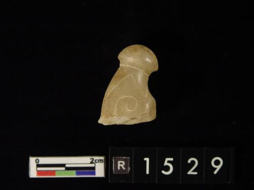 为一面平面,石片上浮出一兽头,兽之两角高耸,下为两眼,石片上下有穿孔,并有涂珠之刻文,惜残缺,不知其全形,色黄。