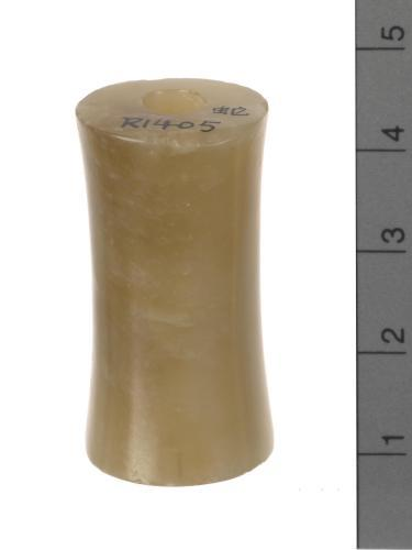 深灰色,带有棕色斑痕,全部磨制,部份沾有棕色土。顶端中拱,似一半圆形,由顶端下渐窄,至中腰又突起似一肩状。下段亦为圆柱,上有绳纹,末端亦为半圆球状。