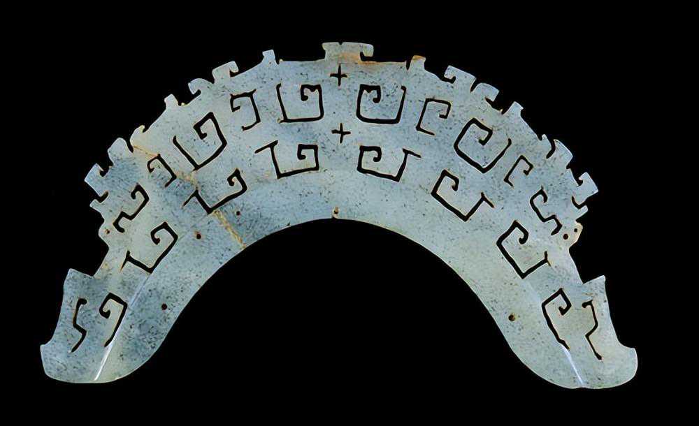 半圆形,上段内圆处有一窄条,但有四小孔,其他全为镂空之云雷纹,质甚硬,色淡青。