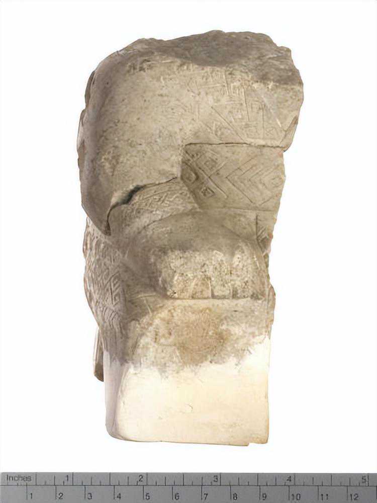 立体雕刻,上宽厚,下窄而稍薄,近梯形,头面具高浮雕之眼鼻角及耳,口大张如长方形槽,无齿,臣形眼,眼珠凸出,上为阴绞钩眉,再上为心形角,两侧有耳,下有阴线纹饰,右耳残缺,头顶似为一甚宽之槽,底平,多处风化剥蚀,鼻残缺,似为凹形,色灰黄。