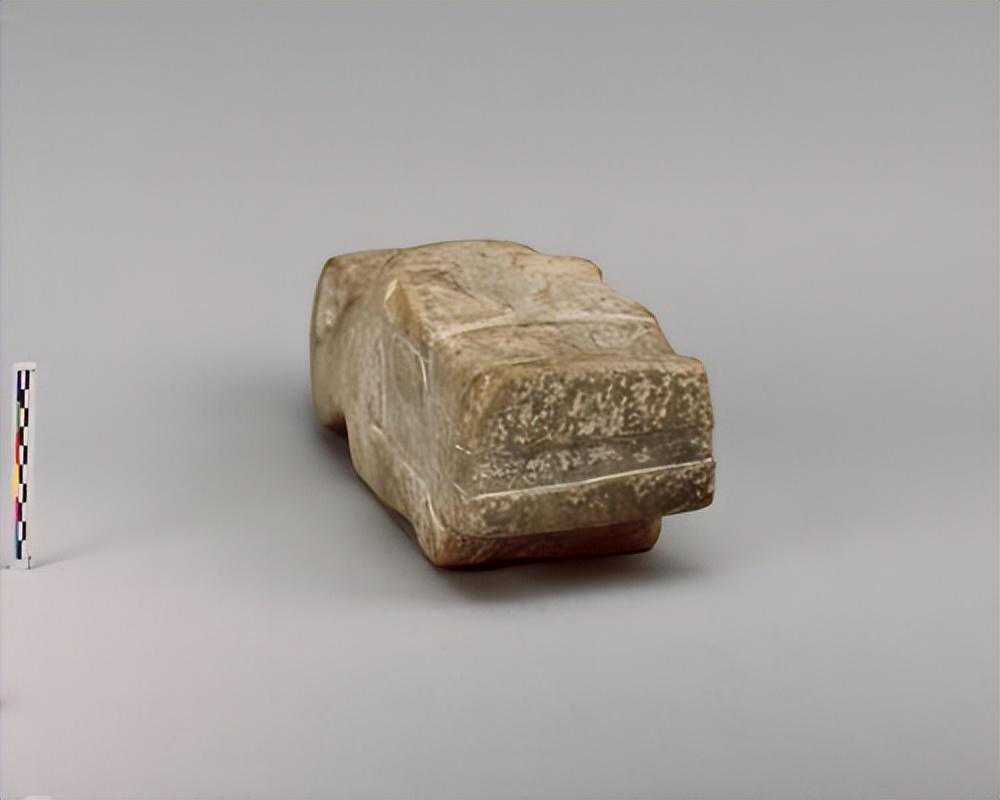 牛形立雕,口微张如一长条,头上两"臣"形眼,鼻刻为"()"形,眼后为一对弯角,曲伏于背上,表面上刻有简单文饰,下为两小耳,仅有阴纹表现,背部近平,四足略具形式,有短尾,色灰白。
