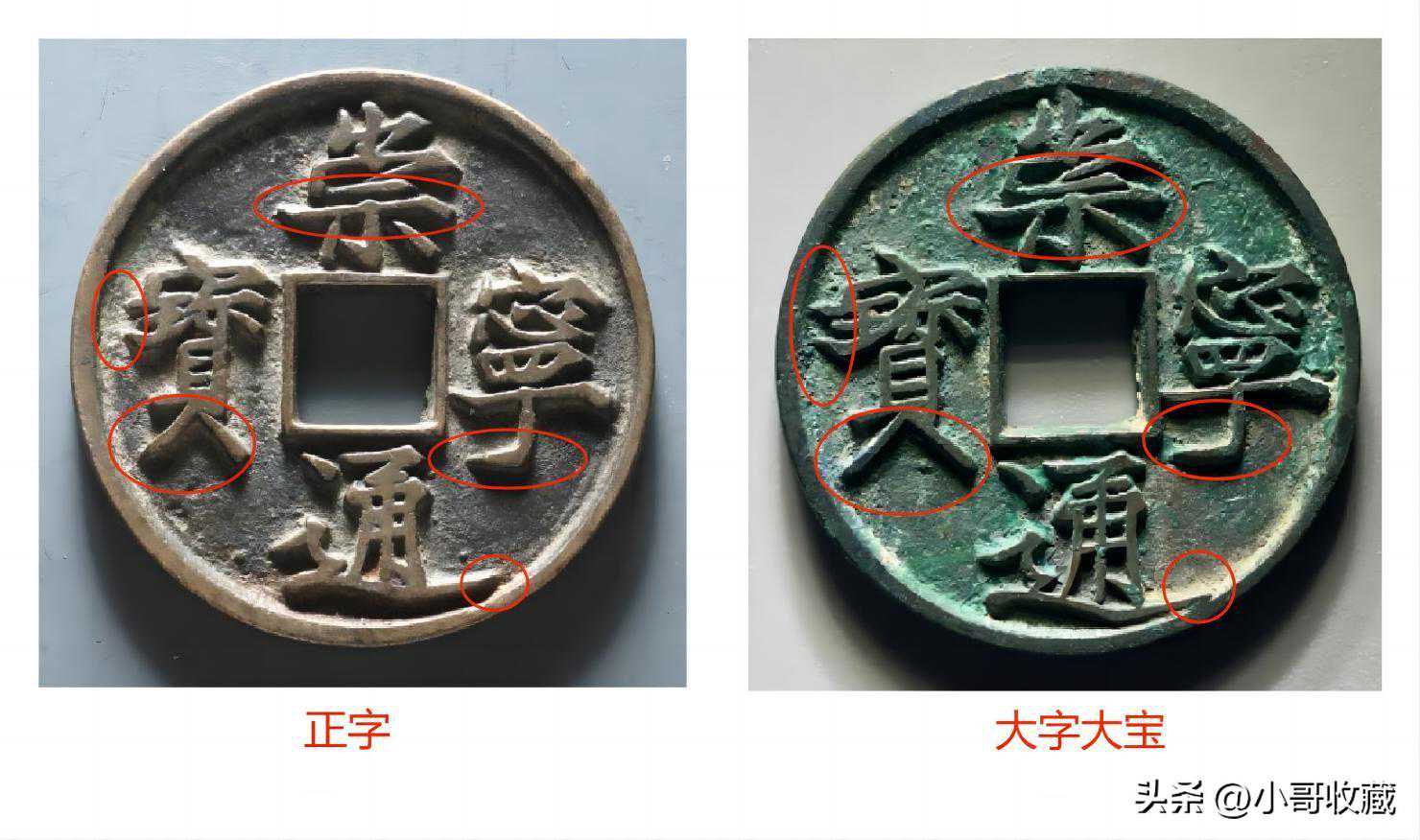 正字与大字大宝的区别非常明显,大字大宝面文的字体比较大,“通”字尾端与外郭相连,“宝”字足非常大并宝足和“王”部非常接近外郭。“宁”字“丁”部最后一笔向下微弯,“崇”字“示”部第二笔左低右高,这些特征正字都不具备。
