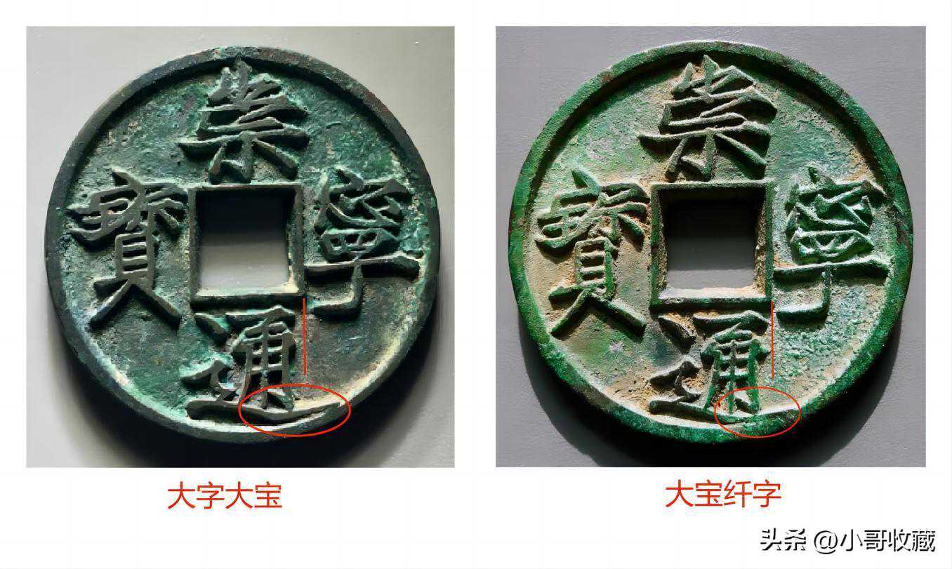 大字大宝和大宝纤字的区别只看面文即可,大宝纤字面文整体纤细,“通”字“辶”部从起折处开始就与外郭相连,“通”字最右端几乎与右内郭线在一条线上,只需要掌握“通”字的特点,即可分辨。