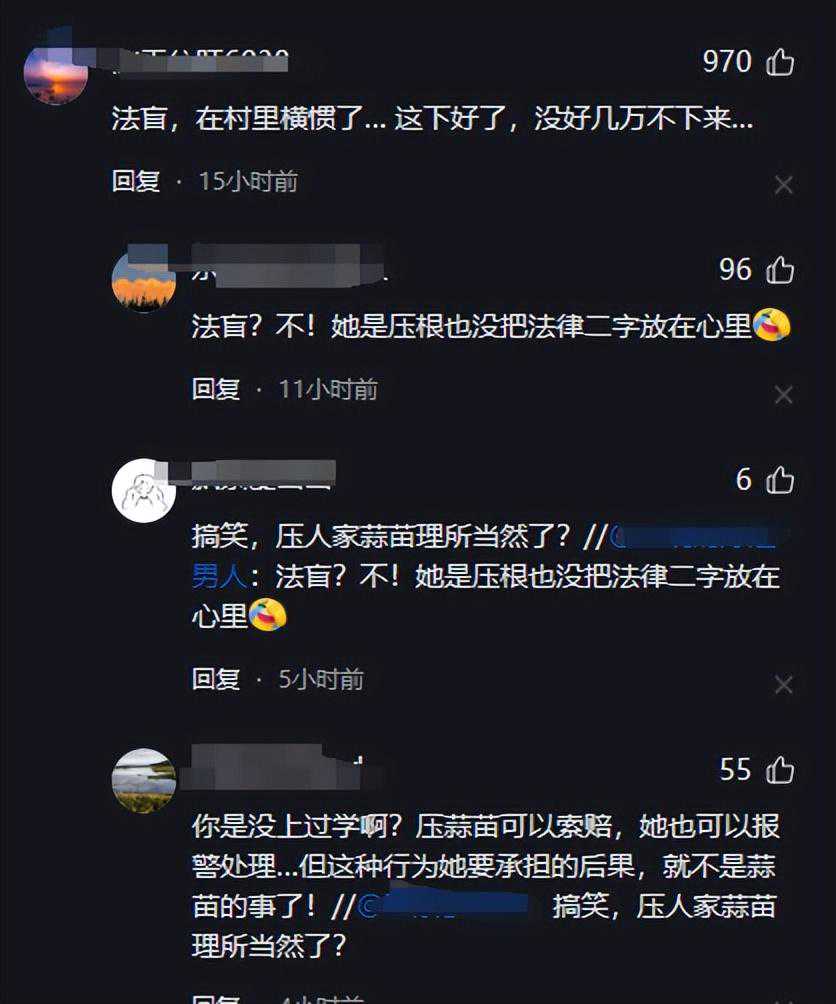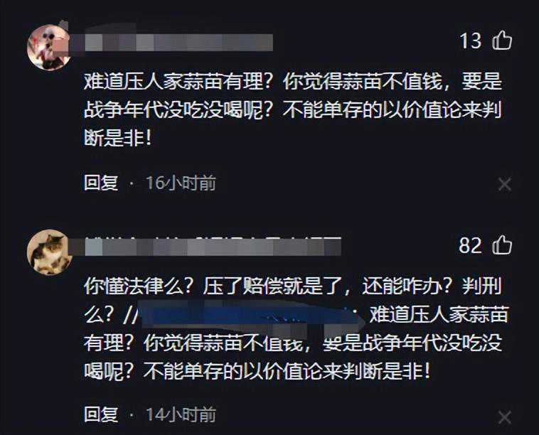 虽然网友基本上都站在车主王女士一边,但也有相当一部分人站在了大妈的角度去思考,说她只不过是一位“普通的农民”,只不过是想维护自己付出心血种植出的作物。