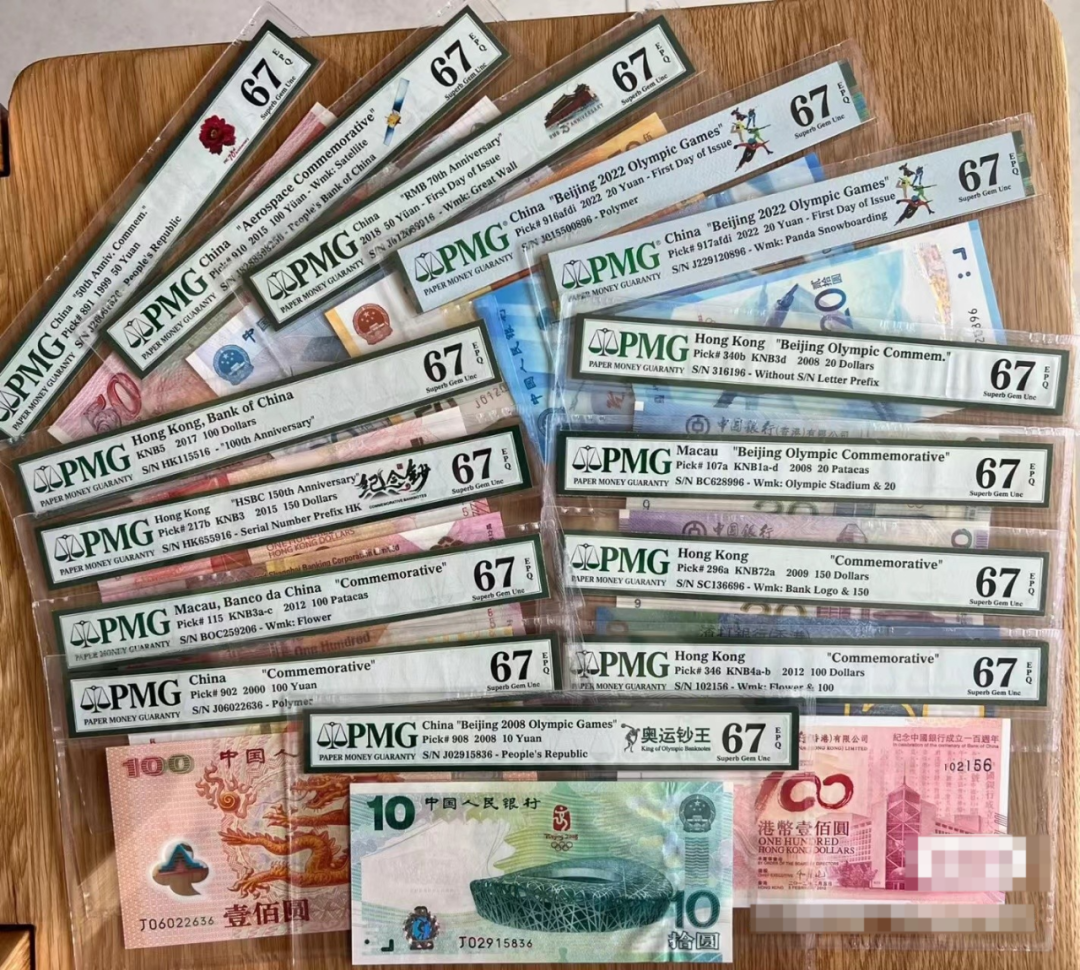 不光把我国发行的几乎所有纪念钞全部集齐,还专挑高货精品,全部都是PMG67分高分的、还都是全部无47的高货精品,