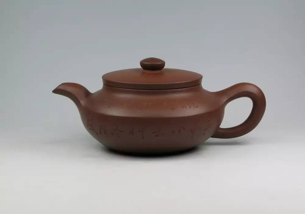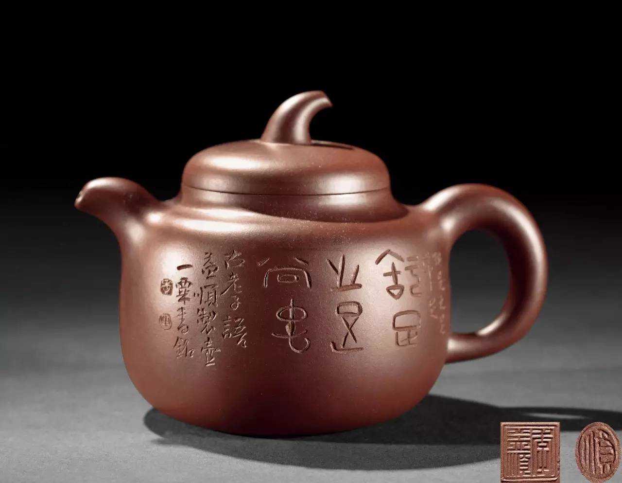 秦权:秦统一六国后统一了度量衡,"权"就是用来称量重量用的秤砣;"秦权"壶就是仿其外型。谁最早创制了秦权壶,无从得知。但晚清梅友竹与韵石合作,一如当年陈鸿寿与杨彭年的传奇。紫砂题铭,直追曼生,神采翻飞。"载船春茗桃源卖,自有人家带秤来。"桃源卖茶,以壶为秤。充满了想象的意境和潇洒不羁的情趣。秦权为壶,气度泰然,刚正不阿。光面古拙中意象万千,顾老更是将秦权做成了素器的巅峰典范。