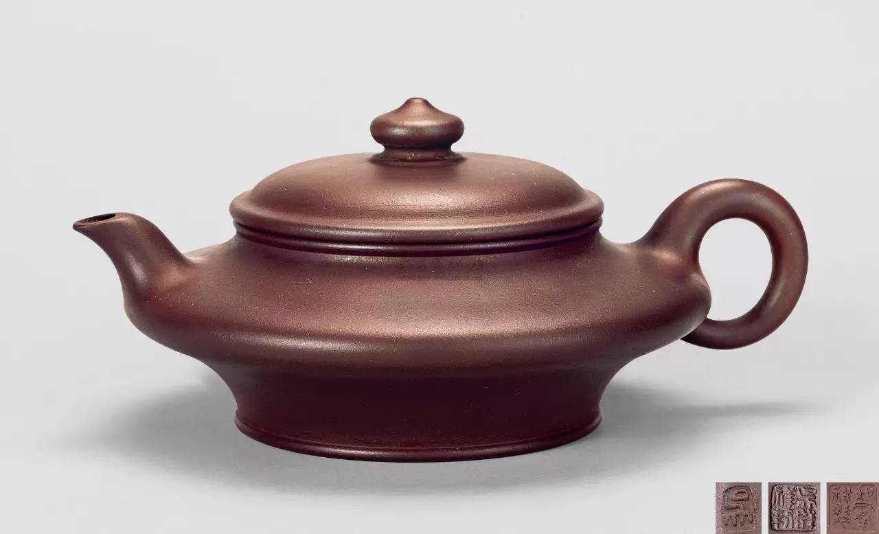 为明·时大彬制。为紫砂壶形制中少见的极扁造型,艺趣盎然,也是早期紫砂壶几何形体造型的代表作品。线面屈曲和谐,寓潇洒于纤巧中,形虽扁而气度却昂,刚柔相济,是时壶中的神品。泥质是较粗的调砂,经烧成后,粗而不糙,粗犷中豪气盎然,这种选料,反映出紫砂的特有肌理,乃时大彬偏师出奇之佳作。时壶刻款是仿唐代欧阳询的书体,铁划银钩,笔力劲道,是鉴定时壶真伪的依据之一。