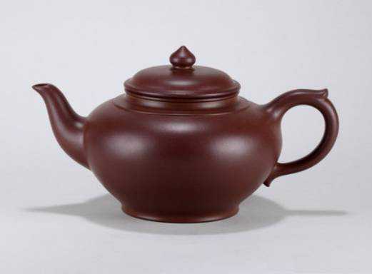 呈铁栗色,表面细润,是以优质紫砂泥制作。壶身呈莲子式,平肩高颈,压盖微穹,三弯嘴粗大,把环而方,扁珠状钮,为典型清中期手工制作特征。加底向内包卷,大平底,做工精细,形制敦实古朴。