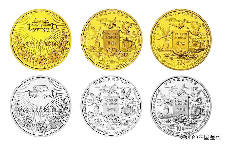 澳门回归祖国金银纪念币(第2组)发行于1998年。一套4枚,金银币正面图案均为天安门及光芒、牡丹花,并刊国名、年号。背面图案上方均为丹顶鹤环绕的“中华人民共和国澳门特别行政区基本法”文本;下方均为澳门东望洋灯塔、妈祖阁建筑及荷花、水纹;外围圆周排列“平稳过渡发展繁荣”中文、英文及葡文字样,并刊面额。