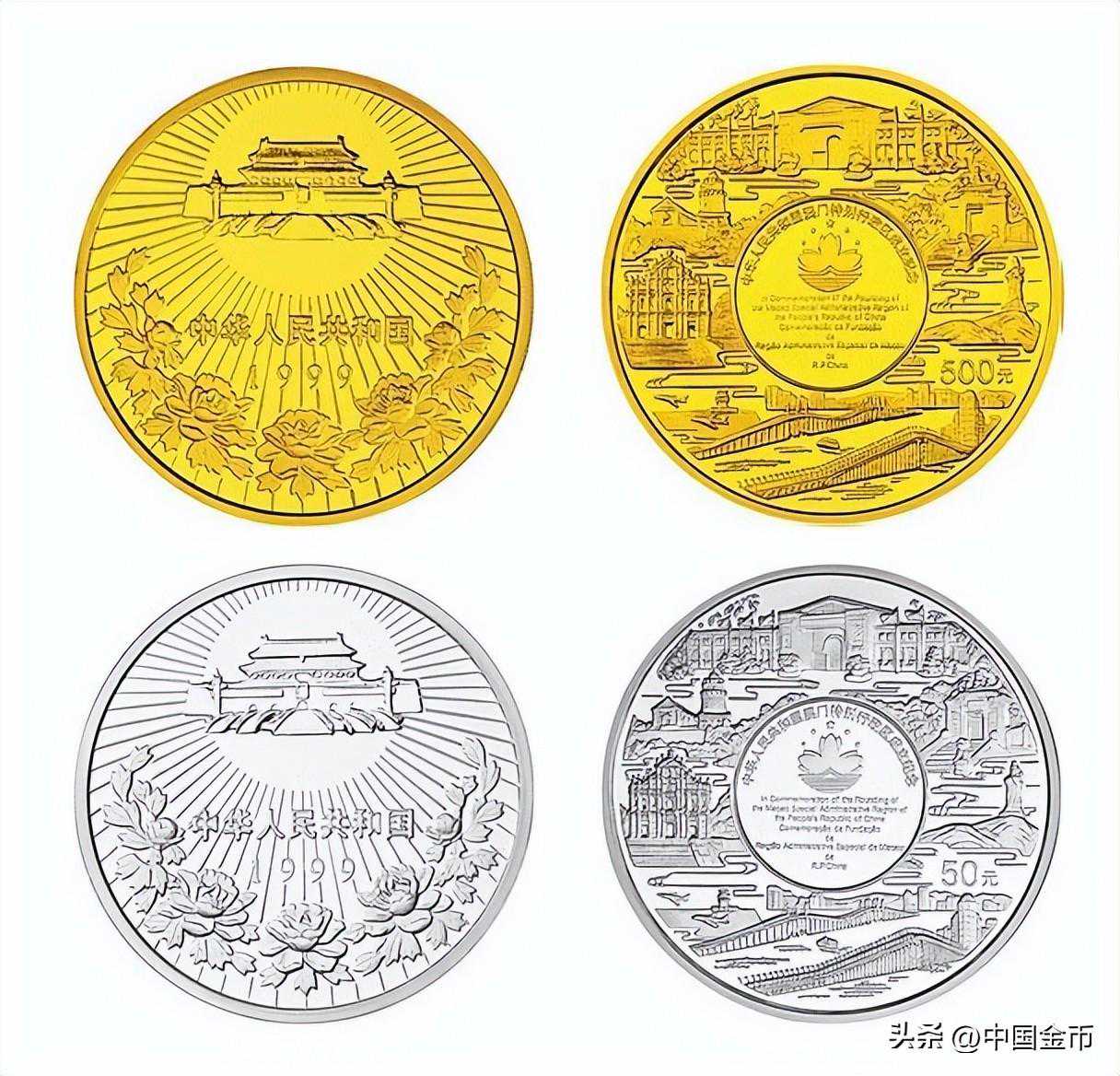 1/2盎司金币和1盎司银币背面图案均为澳门友谊桥、澳门综艺馆、庆祝澳门回归祖国标志、面额及“中华人民共和国澳门特别行政区成立纪念”中文、葡文、英文字样。