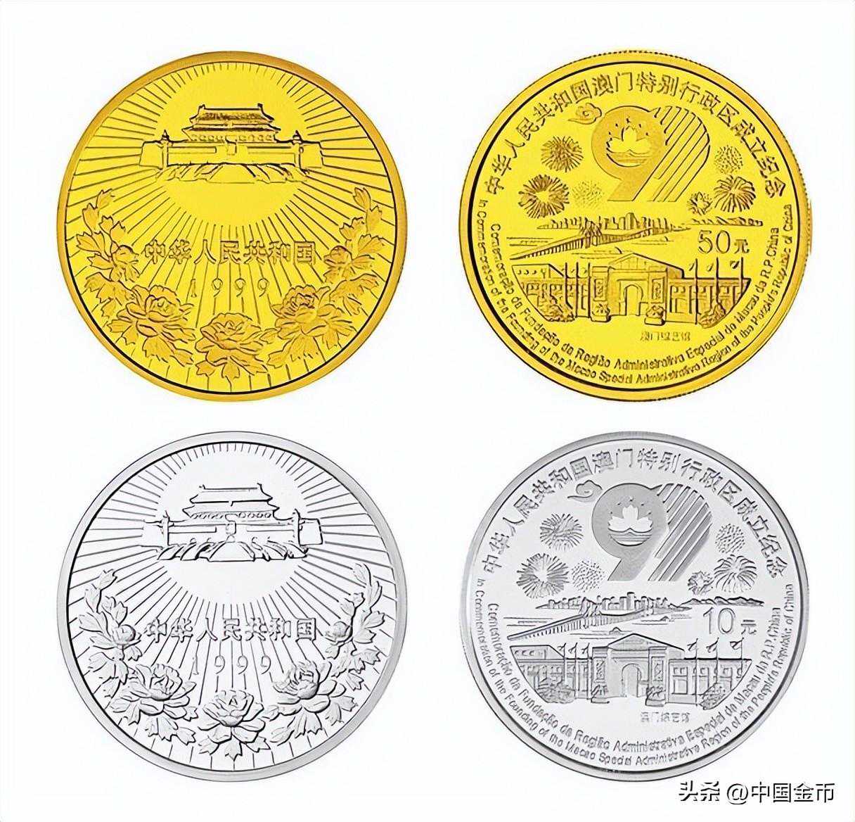 澳门回归祖国金银纪念币(第3组)发行于1999年。一套4枚,金银币正面图案为天安门及光芒、牡丹花,并刊国名、年号。5盎司金银币背面图案均为澳门风光、中华人民共和国澳门特别行政区区徽、面额及“中华人民共和国澳门特别行政区成立纪念”中文、葡文、英文字样。