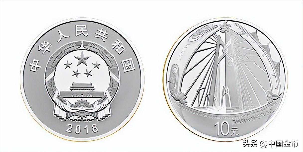 2009年12月15日港珠澳大桥正式开工建设,2018年10月24日正式通车。中国人民银行于通车当日发行了港珠澳大桥通车银质纪念币1枚。正面图案为中华人民共和国国徽,并刊国名、年号;背面图案为港珠澳大桥主体工程青州航道桥主塔、江海直达船航道桥、人工岛建筑造型及紫荆花、三角梅、莲花等元素组合设计,并刊“港珠澳大桥通车纪念”中、英文字样及面额。