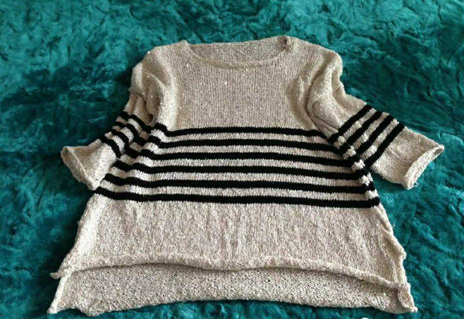 织完了这件,想起来还有米色的埃及棉配上一股亮片线,同样的款趁热又织了一件。
