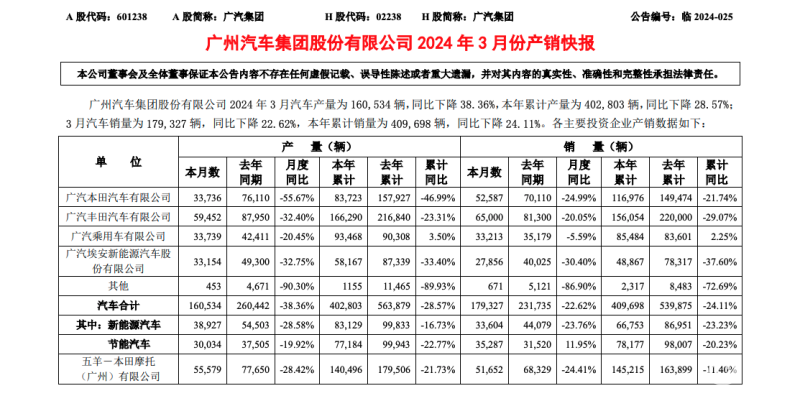 易车讯近日,广汽集团发布公告,2024年3月集团汽车产量为16.05万辆,同比下降38.36%;2024年1-3月累计产量为40.28万辆,同比下降28.57%。3月份集团汽车销量为17.93万辆,同比下降22.62%;2024年1-3月累计销量为40.97万辆,同比下降24.11%。