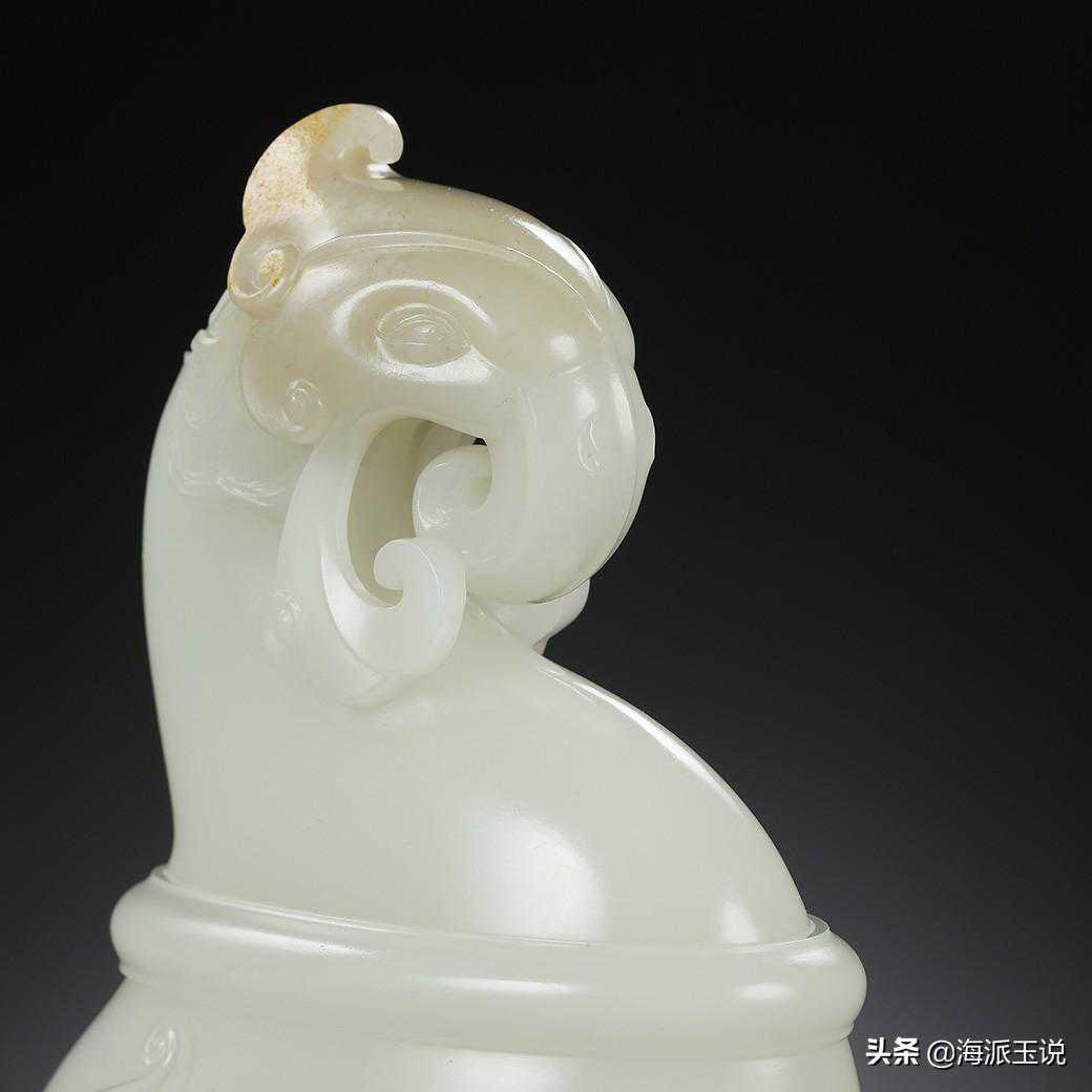 此瓶即是由和田玉籽料雕就,玉质细腻润泽,玉料完美,并带有天然玉皮,以证玉料之出身。此瓶造型别致,整体为天鸡造型,天鸡为上古神鸟,率天下之鸡报晓。玉瓶盖以几何线条及弧面为之,与瓶身以子母口相连,纹丝合缝。瓶身其余皆光素无饰,既有平安无事之吉祥意,也展示了润美玉质。玉瓶在玉雕器皿中占有重要地位,多用于陈设或插花。通观此瓶,用料端方精良,玉质温润,刀工细腻流畅,造型古朴厚重,琢刻规整,精工细作,具雍容华贵的王者风范。