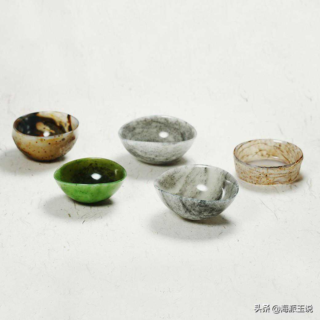 此套玉杯一套五件,由碧玉、玛瑙以及和田青花三种玉材雕就,在玉杯之上不雕琢纹饰,以展示玉材的天然纹理之美,尤其是青花中水墨的晕染效果,玛瑙的天然颜色及纹理变化,非常别致,富有朴茂意蕴,是一套非常实用的茶道妙品。
