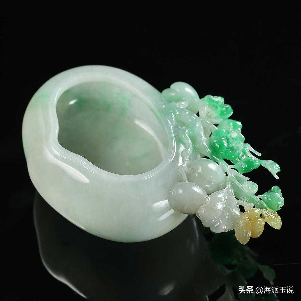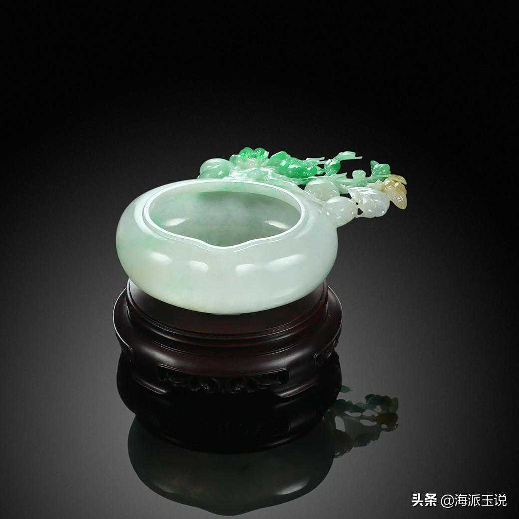 水洗以翡翠为材,点点翠色雕琢为桃花,或含苞,或怒放,雕刻精细,花蕊清晰可辨,花瓣层次亦为丰富。整体雕琢为水洗造型,一两枝桃花自口沿斜探而出,颇为精妙。在此器中,作者对于镂空雕及立体雕技法的运用,可谓炉火纯青。取其“桃”“洗”之谐音,本器具“讨喜”之吉祥意。杨光:中国玉石雕刻大师。