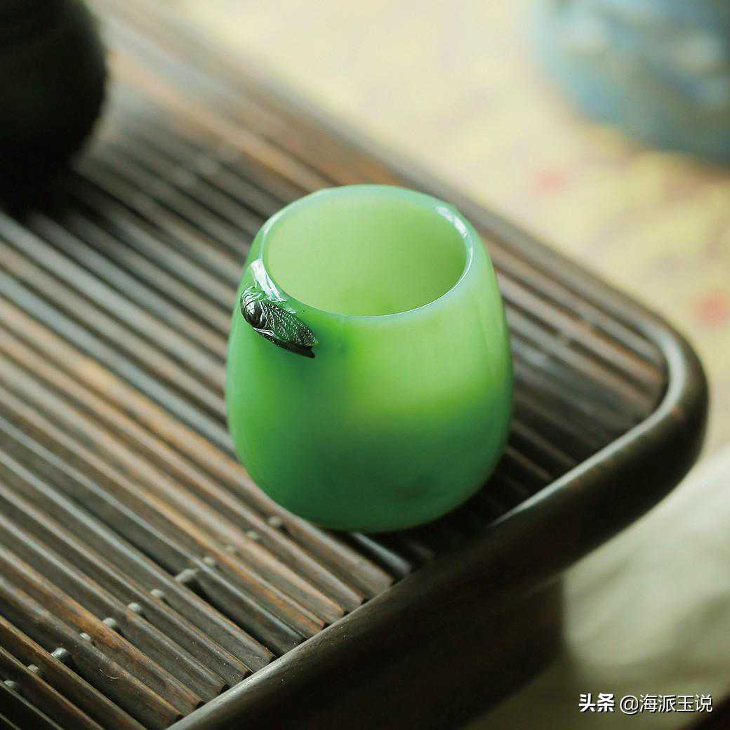 茶道中以玉为材者,皆为上品。此杯为碧玉质,色或浓翠欲滴,或如天青之色,浓淡相宜。一抹褐色俏雕为蝉,取其谐音,具禅悟修行之意。而杯口内敛,五道自杯口而其至杯身中部隐起的线条,颇富张力,为点睛之笔。
