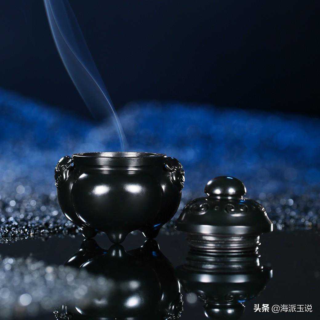 此炉为墨玉质,色泽厚重,玉质细腻,尤其适合于创作炉瓶器皿类作品。香炉器型饱满圆润,饰以兽面及如意纹饰,既可把玩于手,也可放置于书房案头,焚香清修。“文房百器,炉为首器。”香炉种类繁多,质料多样,其中历代陶瓷类的香炉更是窑口众多,造型迥异,除了礼佛、祭祖,还有一些制作小巧精美的香炉,成为文人雅士案头琴旁的装点之物。
