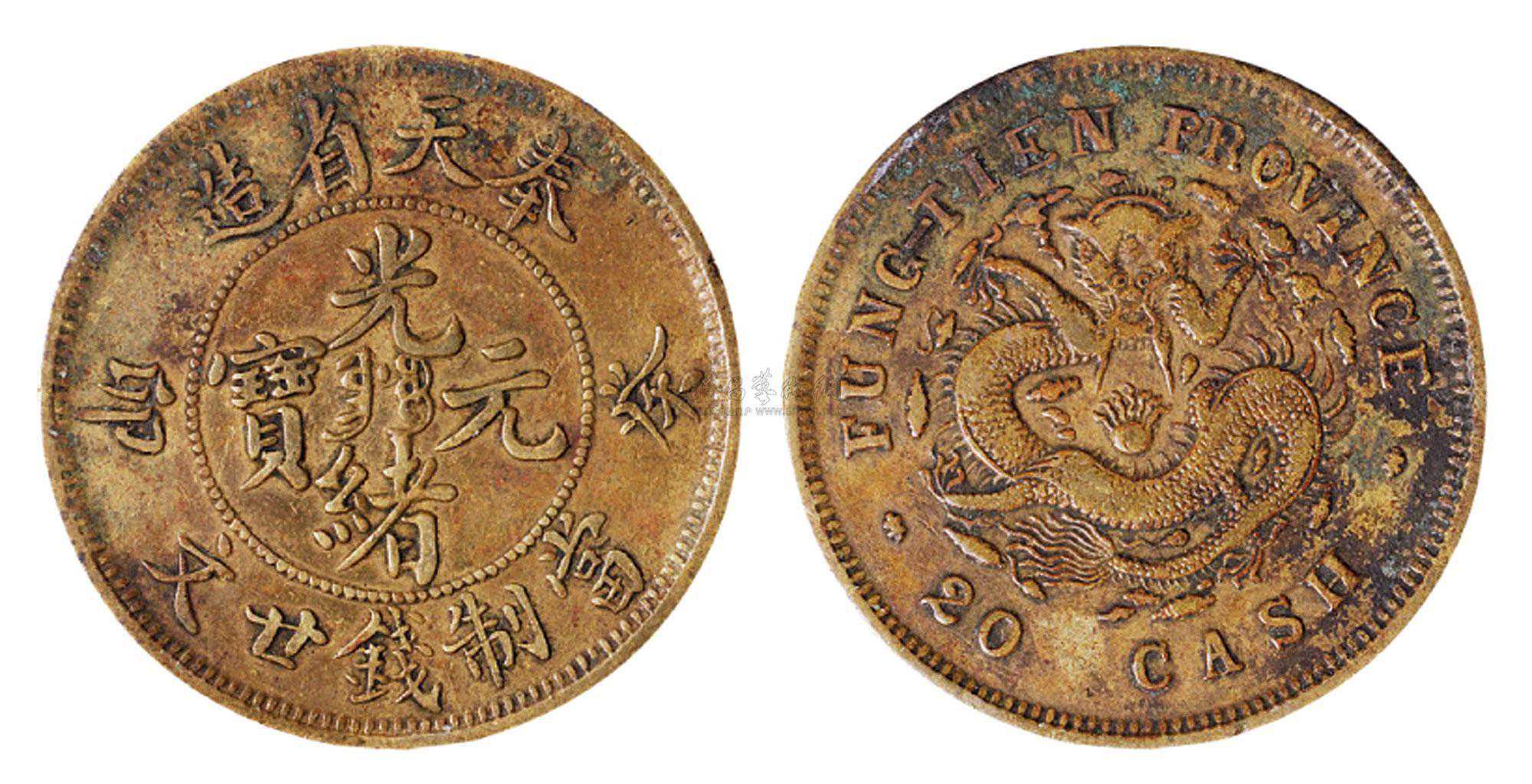 光绪二十九年(1903年)奉天造币厂行干支纪年“癸卯”的“光绪元宝”币值“七钱二分”、“一两”二种。奉天一两最早一次露面是在1904年美国路易斯安那洲的中国藏品展览会上,以后便匿迹几十年,本世纪五十年代初这玫稀世珍品复于香港出现。此币奇异之处:正面为库平银一两,背面英文却显示为湖北省和库平七钱二分字样,寓意阴阳颠倒,上下不协。背面蟠龙灵异有神,龙鳞雕刻细密有致。