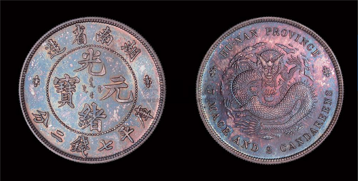 《1897年(光绪二十三年)6月21日,湖南巡抚陈宝箴向清廷奏请铸造银元,获准后从英国定购了银币铸造设备。『湖南省造光绪元宝库平七钱二分银币』的铸造时间大约在光绪二十四年(1898年),因铸额小传世稀罕而不为广大历史钱币收藏者和研究者所熟悉。本人经过长期探访和研究认为,其铸造银币的钢模可能由当时银币铸造和「钢模制作」技朮较为成熟『湖北银元局』代为制作。湖南省造光绪元宝库平七钱二分银币正面中央珠圈内镌满汉文“光绪元宝”四个字,珠圈外上端镌汉文铸地“湖南省造”四字,下端镌汉文币值“库平七钱二分”六字,左右两端各镌一个长六花星,汉字书写风格和「湖北省造光绪元宝」的汉字风格形神相同,可以认为均系同一位书法家所书。银币背面中央镌蟠龙图和云纹,上端环镌英文湖南省HU-NANPROVINCE,下端环镌英文币值库平七钱二分7MACEAND2CANDAREENS,左右两端各镌一个六点花星。》