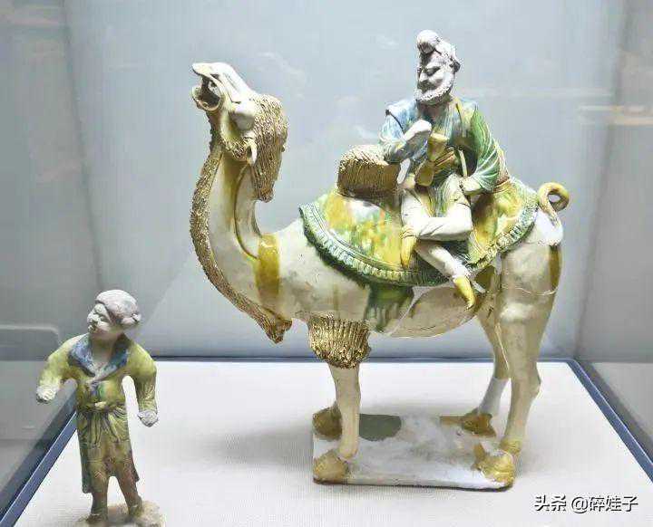2002年西安市长安区郭杜乡一座唐墓出土了一件胡人俑和一件载物卧驼。胡人俑高42.6厘米,高鼻深目,双眉突出,双耳系耳套,头戴黑色幞头,面部略带一丝笑。身着黄色圆领紧袖长袍,腰束带,右臂弯曲至胸前,作牵驼状。足蹬圆口鞋,站立于方形托板上。胡人旁边有一载物卧驼,高29。1厘米,长45厘米,驼首高昂,双目圆睁,作嘶鸣状,前后肢屈跪卧地,后肢似在用力,尾巴盘曲上翘,表现了载着货物的骆驼正在奋力起立时一瞬间的情景。驼的背上垫一椭圆形毡,毡四周有打褶的花边,施草绿色和白色釉。