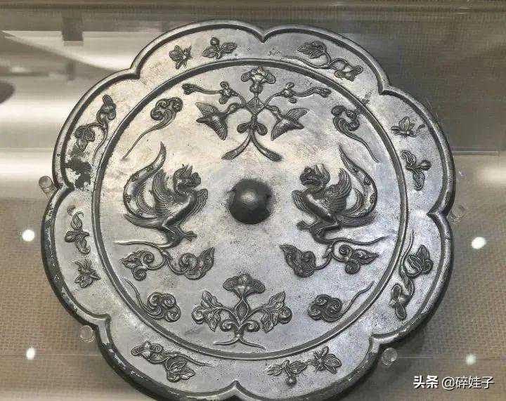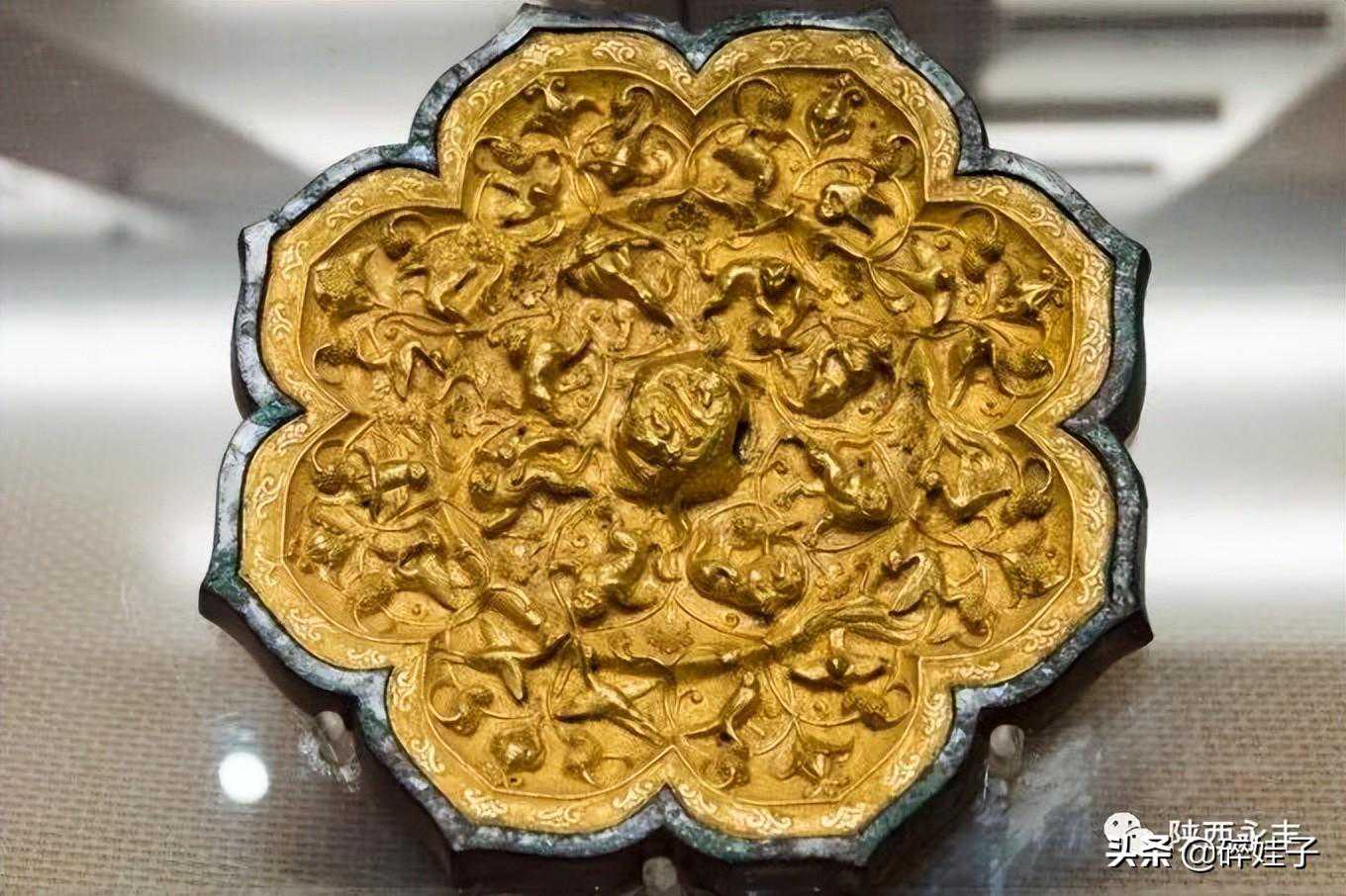 西安博物院镇馆之宝。2002年西安市灞桥区马家沟村出土,直径19.68厘米。镜为八瓣菱花形,背贴一金壳,其上锤揲出浮雕式装饰纹样。中间凸起的钮部饰一对追尾式双兽,一周凸棱将壳面纹饰分为内外两区。内区饰8只神兽与缠枝蔓草。内区的缠枝花草蔓延过凸棱进入外区,在8个菱瓣内盛开,每瓣当中有四叶花苞正对菱花形中央,两侧垂以葡萄果实,下有两鸟噙枝啄籽。葡萄纹装饰盛行于西域,唐初传入,与内地传统的瑞兽纹相结合,是文化交流的产物。葡萄纹铜镜出现于唐高宗李治时期,武则天时期较为流行,唐玄宗后期逐渐消失。金背镜是唐代制镜的绝艺之一。