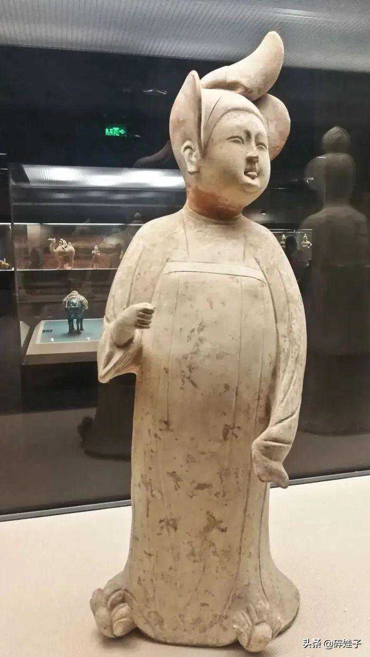 1988年出土于西安市新城区韩森寨红旗电机厂唐墓。安史之乱后,唐墓随葬品中曾经流行的仪仗佣和骑马俑少见,表现家庭生活的侍佣,尤其是女侍佣较多,但唐后期,总体佣类大大减少,晚唐时更为罕见。这组仕女佣是典型盛唐写照,健康丰满,表情自然活泼,生活气息很浓。