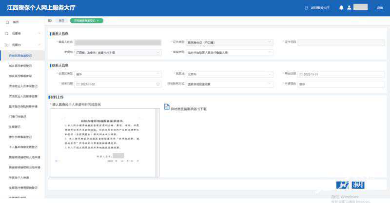步骤二:选择“我要办”—“异地备案登记”—选择备案类型—选择“就医地”“开始日期”、“结束日期”—下载异地备案承诺书—上传签名承诺书—提交