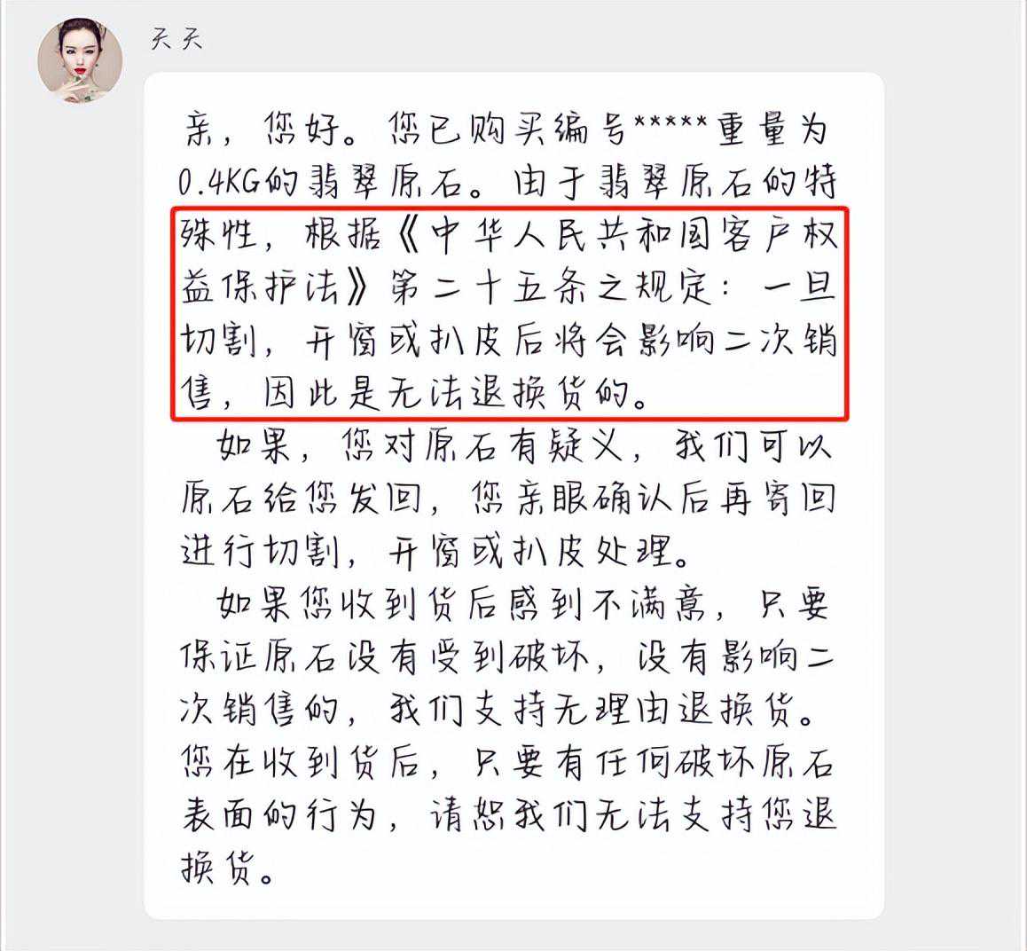 只要确认了代加工,那么当购买的原石切开发现不是翡翠后,便会被加工成一个看不出原样的石头,从而完成定作的标准。也就是说,很难再退货退款。