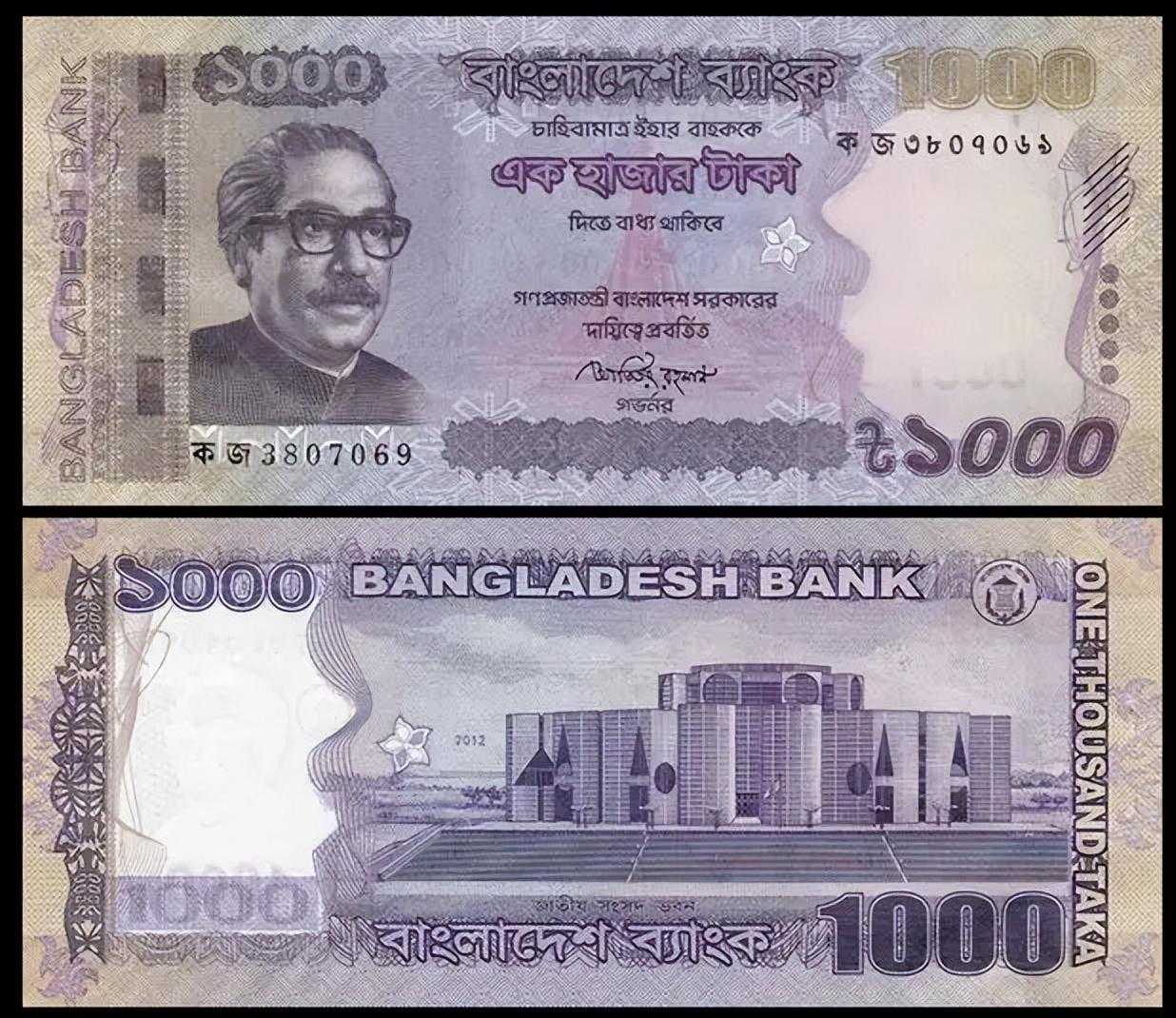 孟加拉国的货币叫做“塔卡”,最高面值1000塔卡约合70元人民币。1000塔卡正面人物均为第一任孟加拉国总统谢赫·穆吉布·拉赫曼(1920-1975),背面是孟加拉的国会大厦。