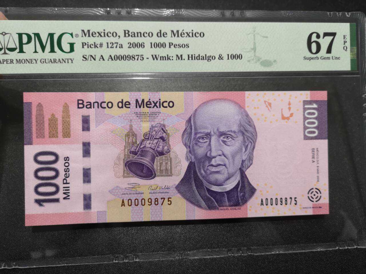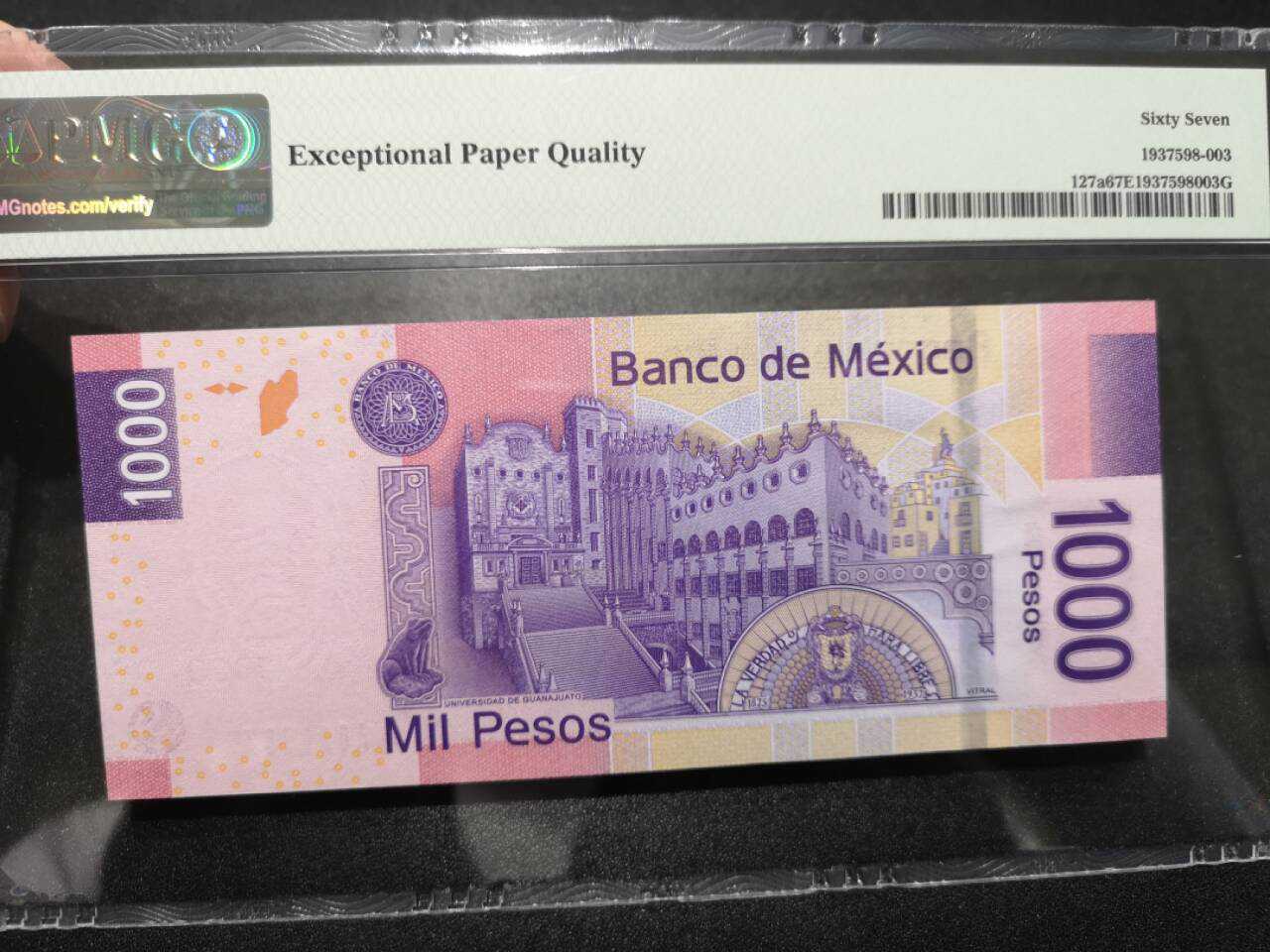 1000比索正面印有墨西哥独立之父,民族英雄米格尔·伊达尔戈·伊·科斯蒂利亚神甫,背面则是墨西哥名学府瓜纳华托大学。
