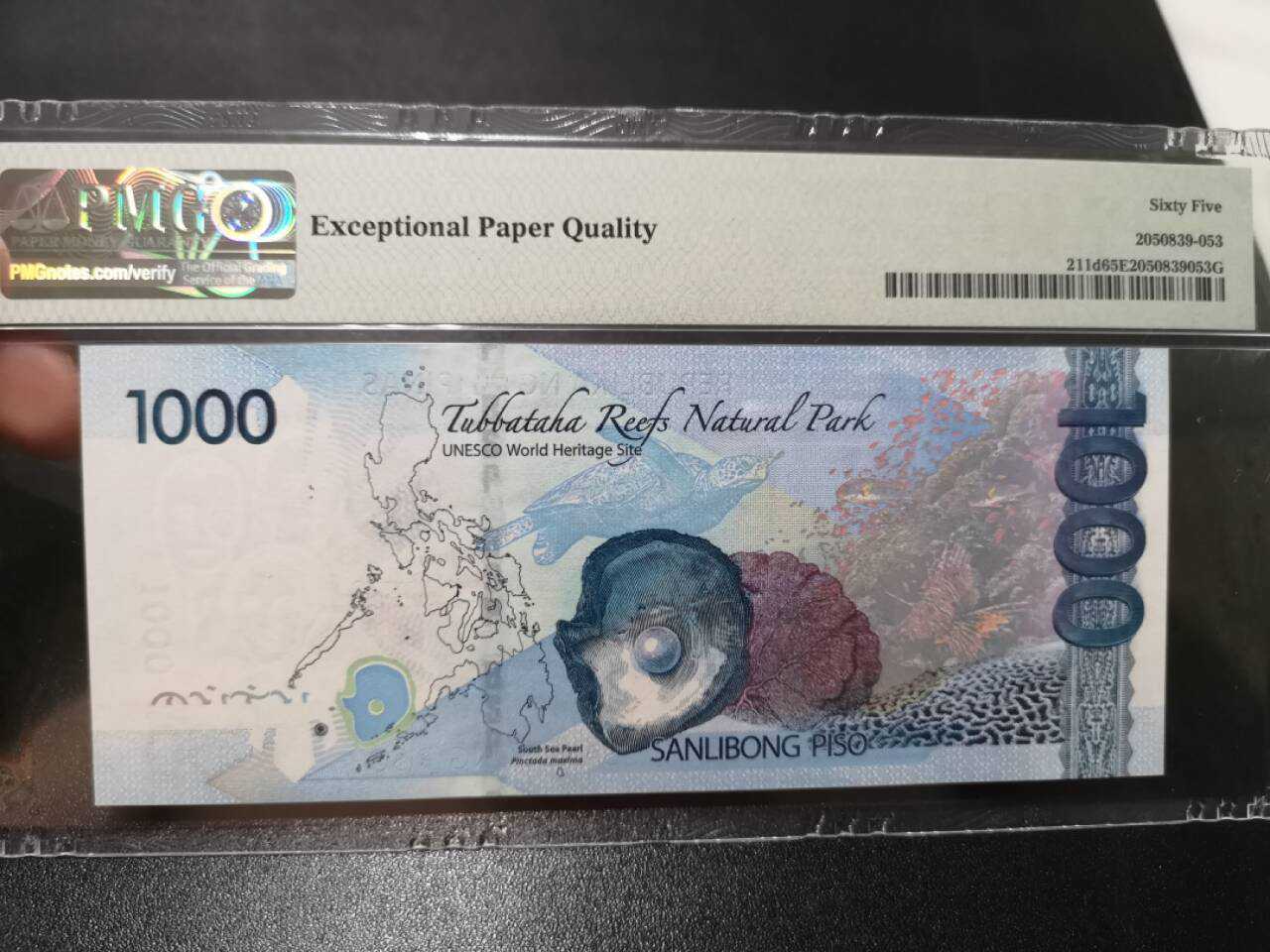 1000比索体现的当地文化丰富,正面三位人物中的唯一女性是菲律宾女童子军创始人约瑟法·利亚内斯·埃斯科达。背面印有苏禄海的图巴塔哈群礁海洋公园,南海珍珠以及棉兰老岛地方特色编织图案。